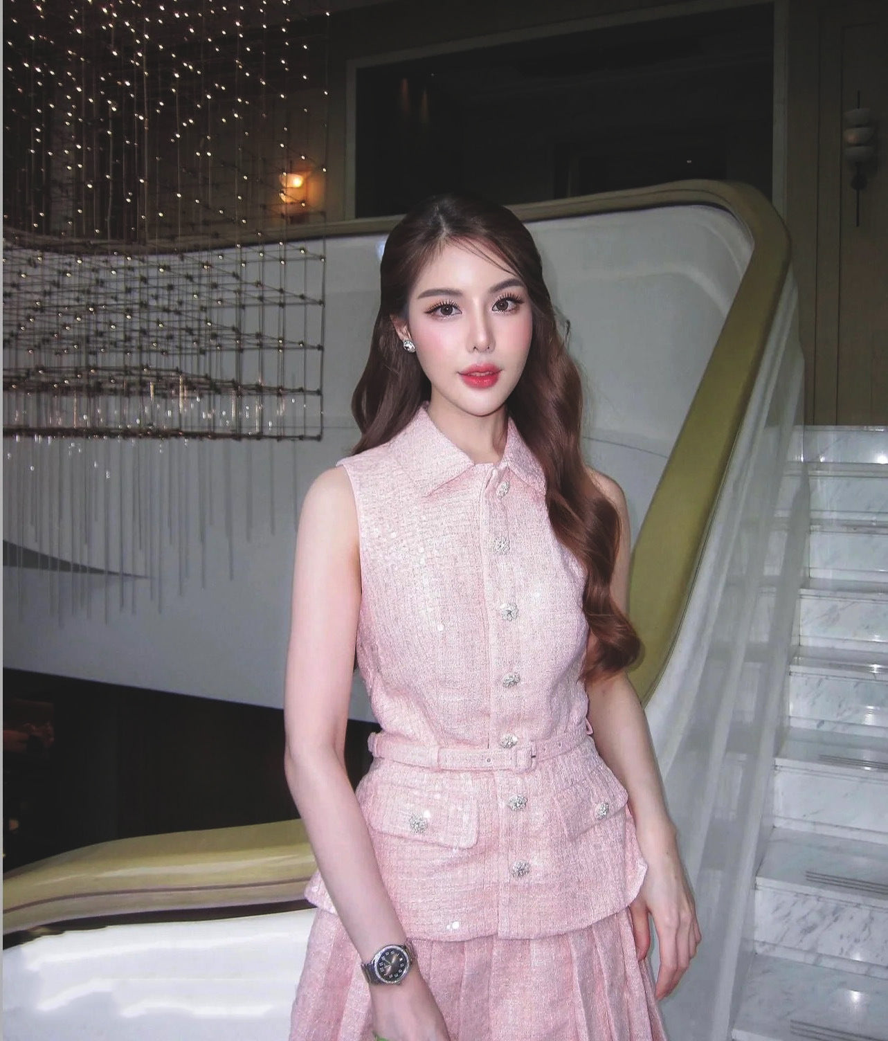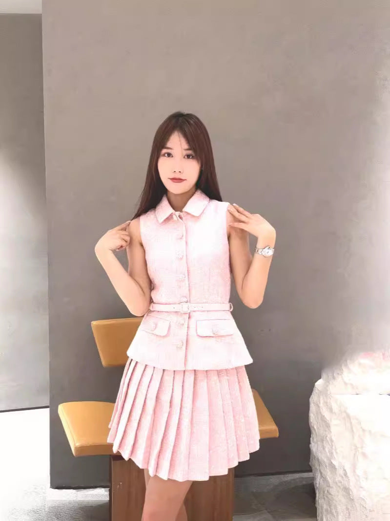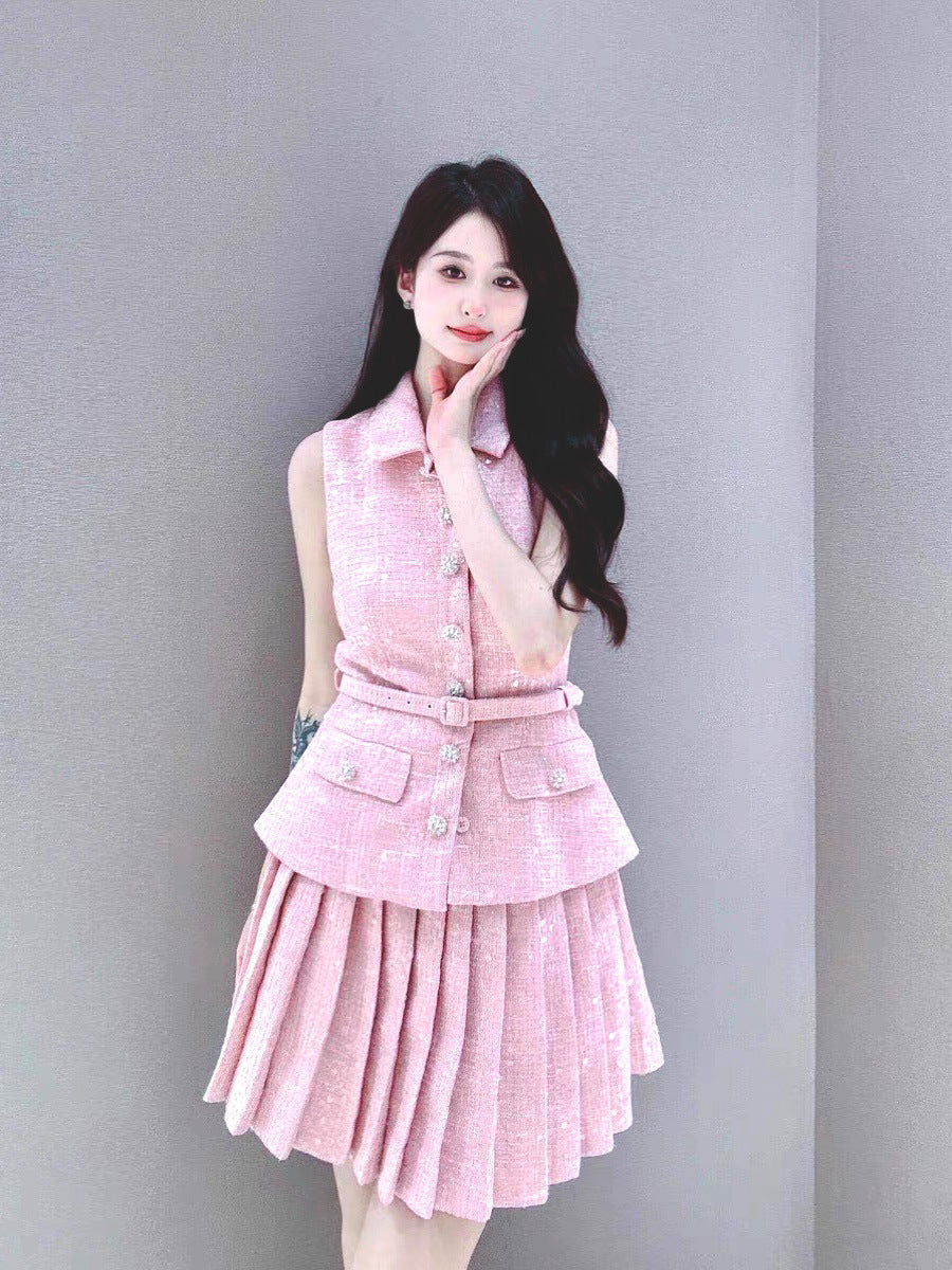 Design Pink Temperament Beads Top 2024 Summer Beauty POLO Received Waist 100 Folded Skirts Two Pieces