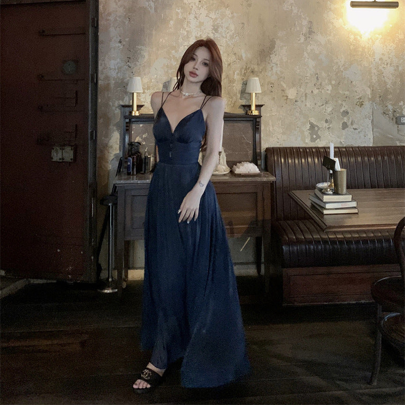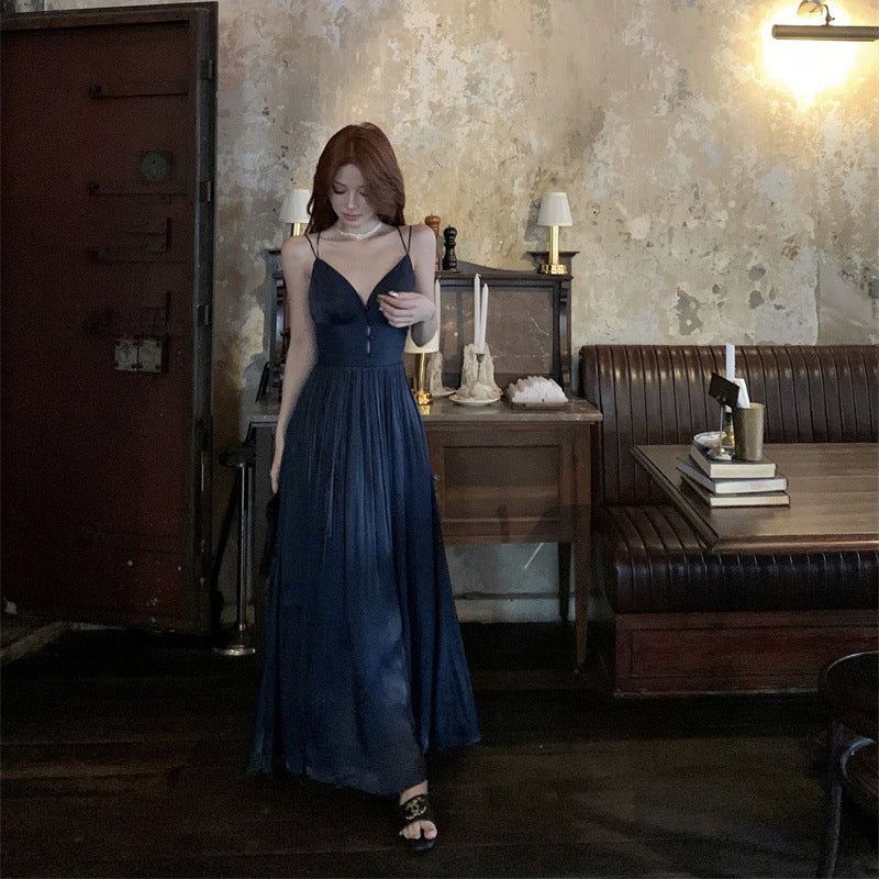 Desire To Show The Back V Tie Sling Dress Women Summer High-End French A-Shaped Dress Folded Waist Dress Long Dress
