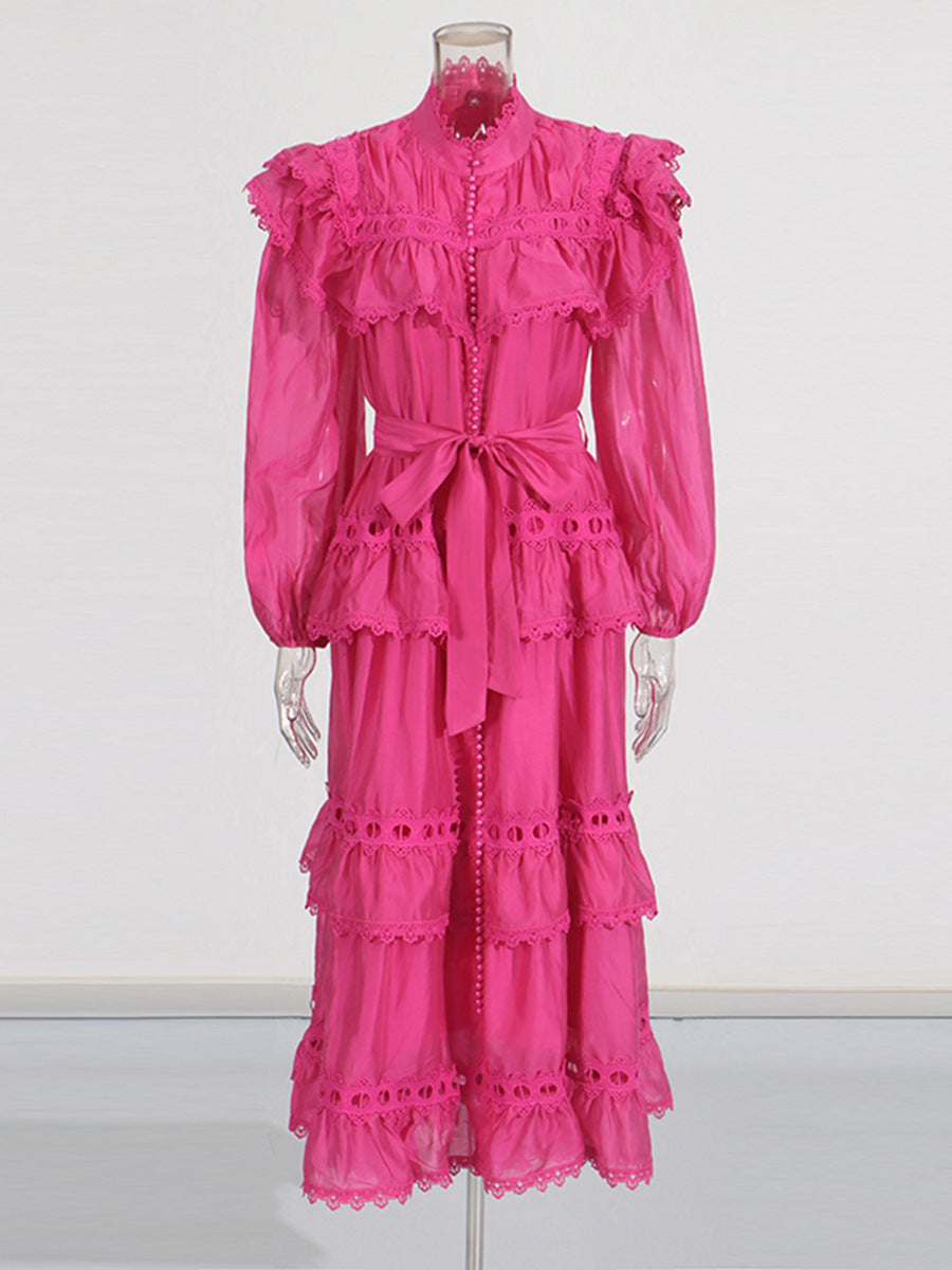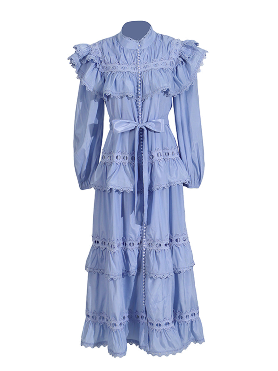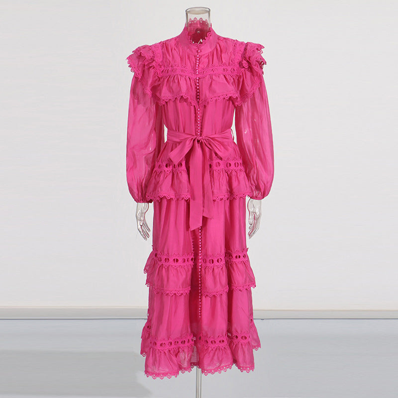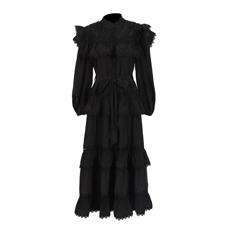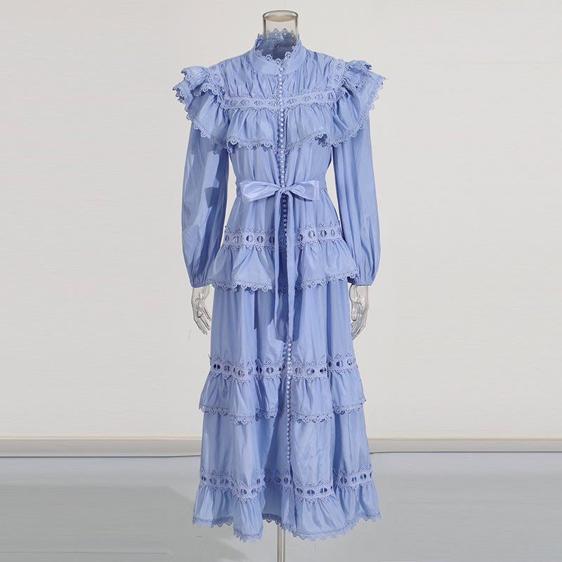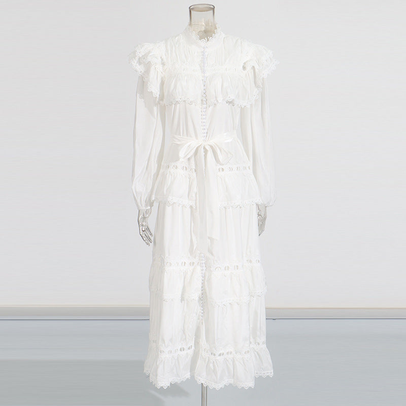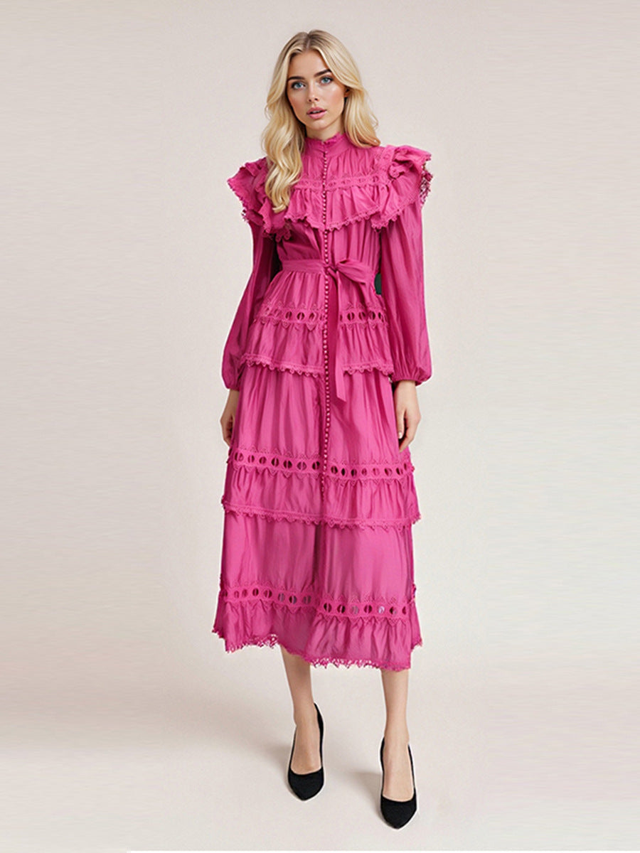 Dream Collar Wood Ear Folding Single Row Buckle Dress 2025 New Women's Summer Long Sleeves Pure Color Dress Dress Girl