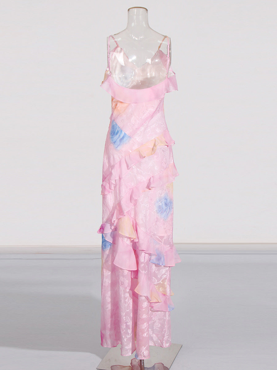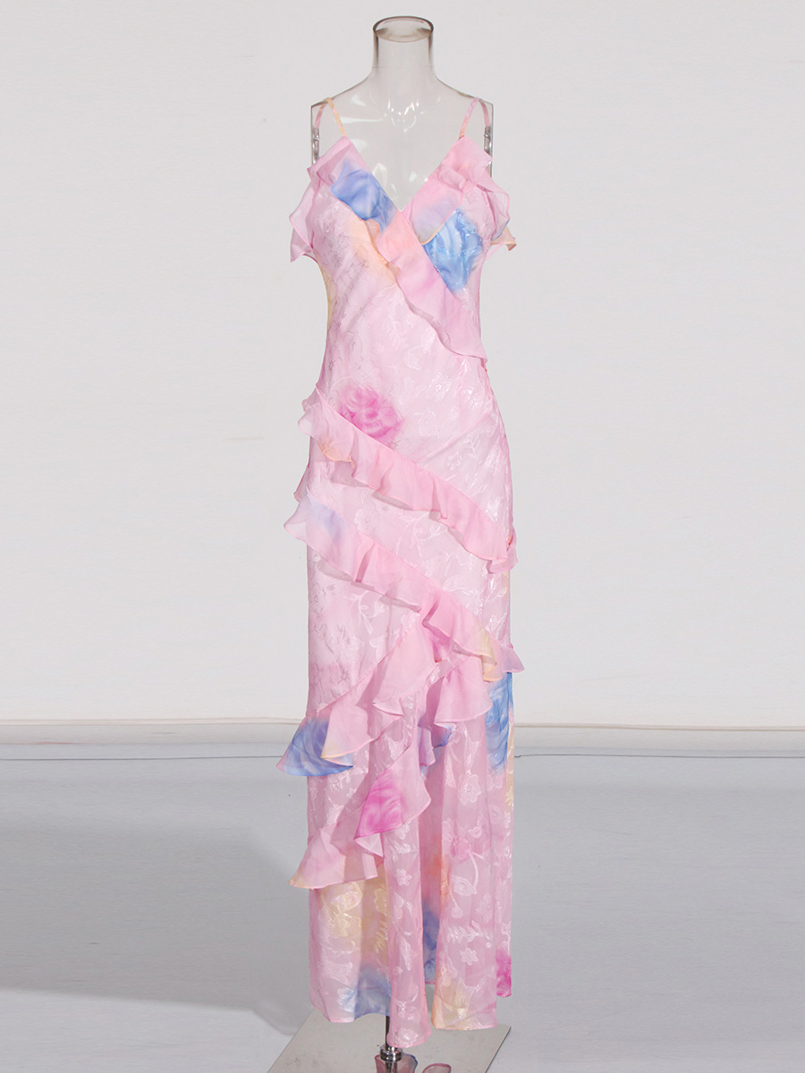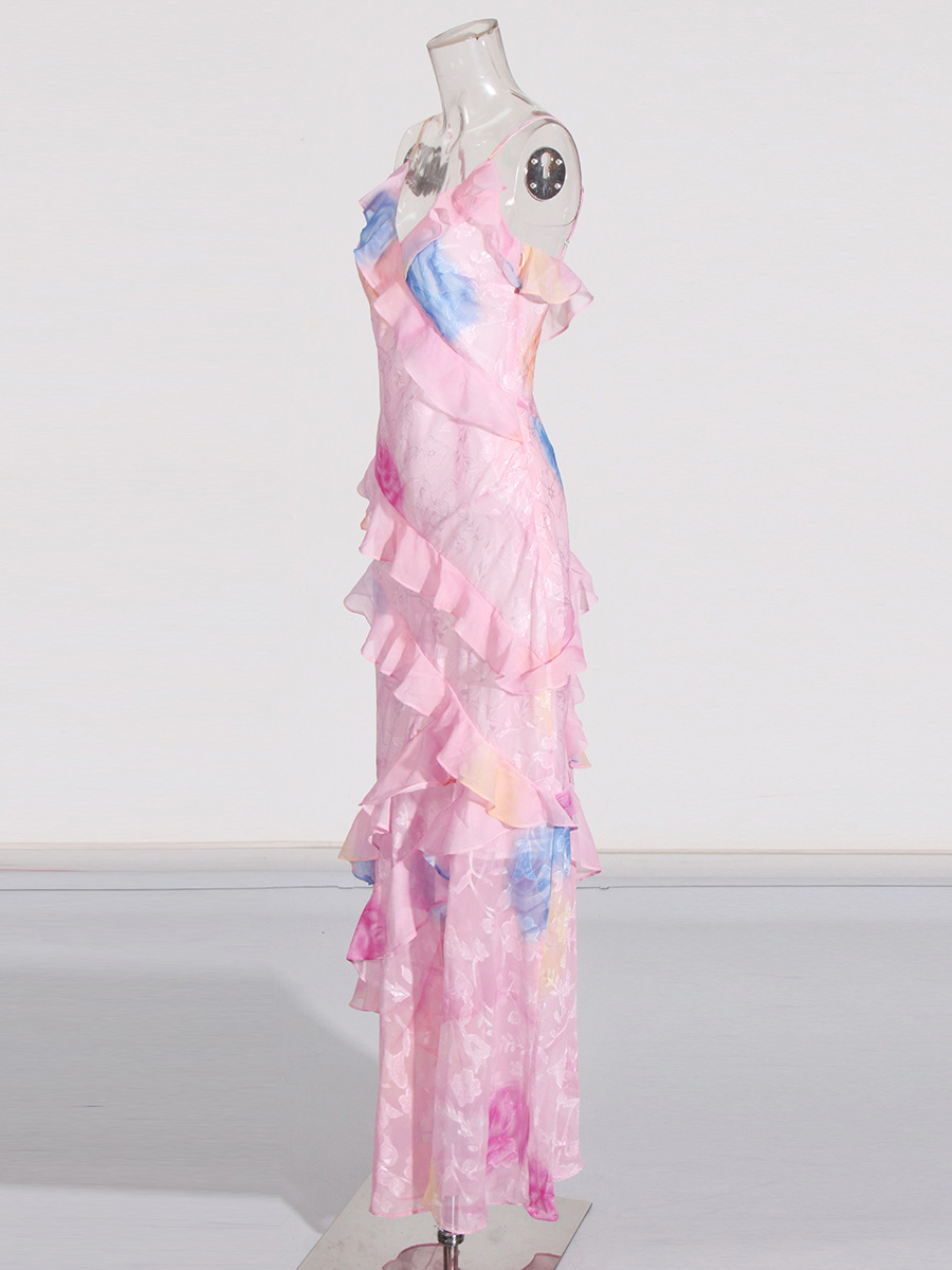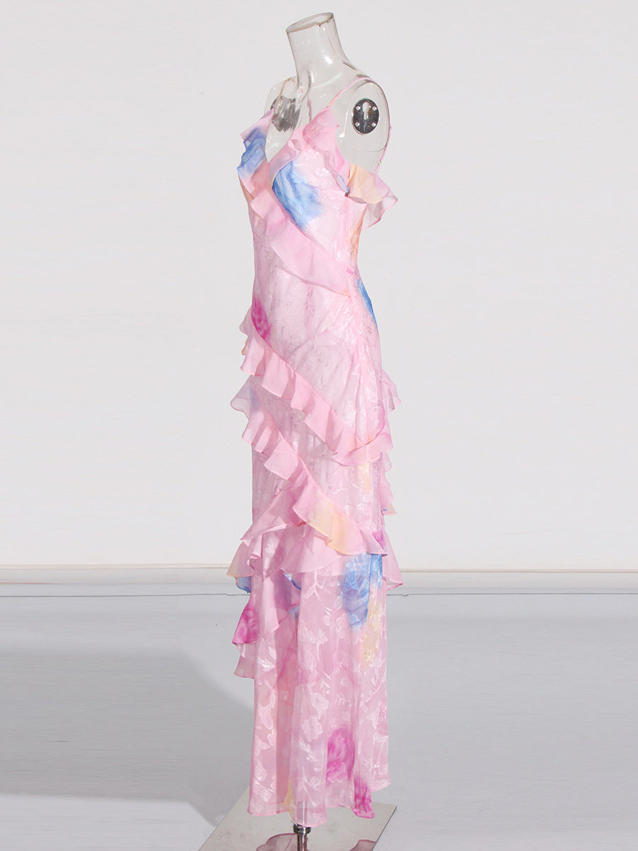 Elegant Tea Break Dress 2025 Summer New Slings Print Backs To The Leaves Of The Dress Woman HZ0628