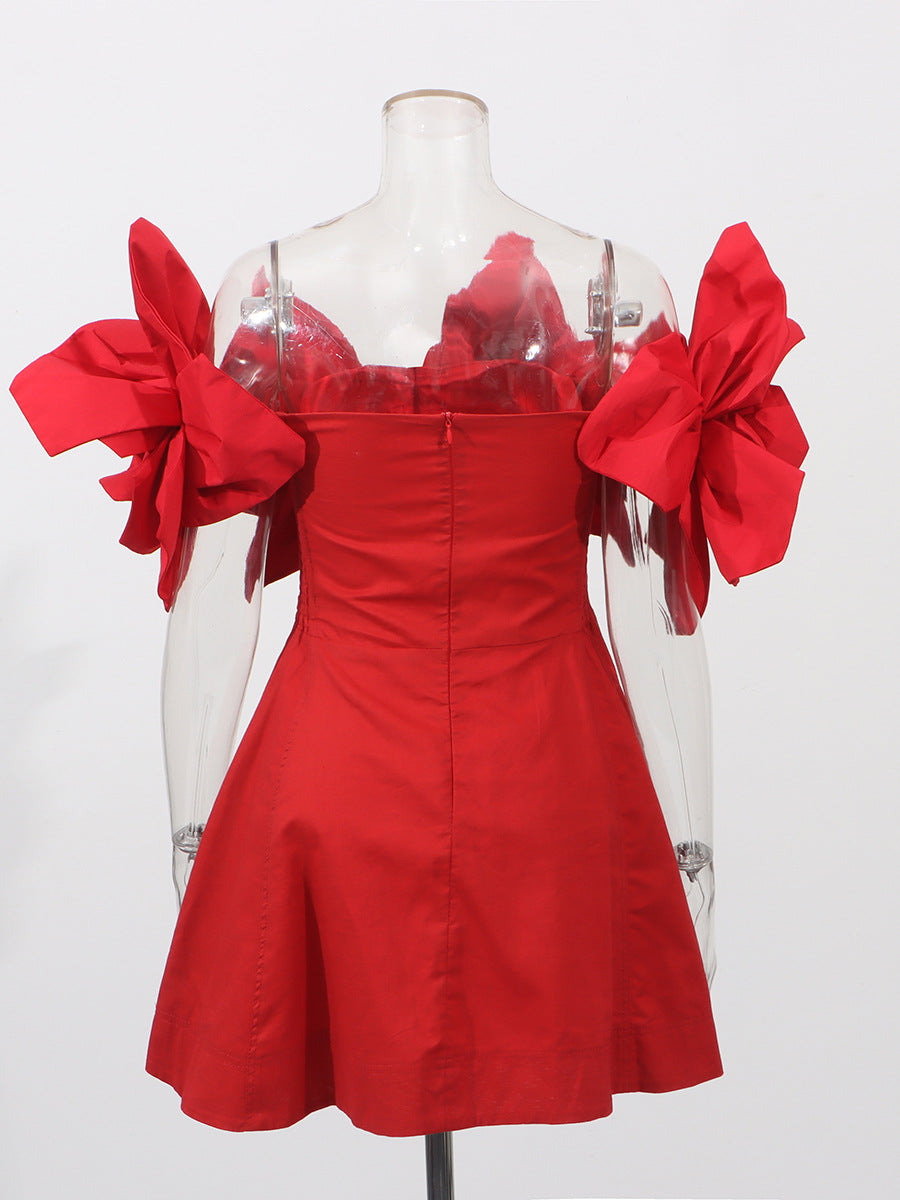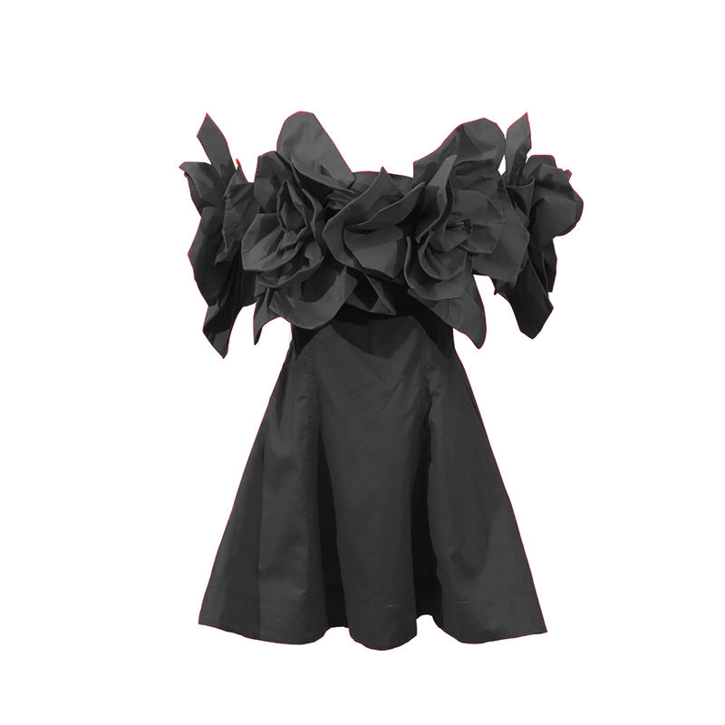 Evening Dress Three-Dimensional Flowers Spliced A Word Shoulder Skirt 2025 New Women's Summer Waist Solid Color Dress Women