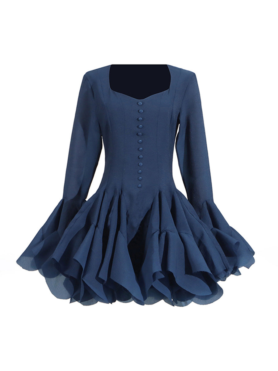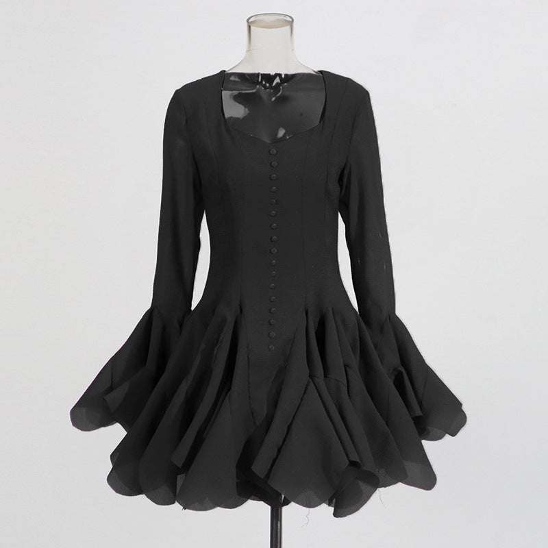 Fairy Dress 2025 New Square Collar Single Buckle Lotus Side Horn Sleeve Short Dress