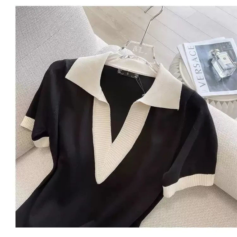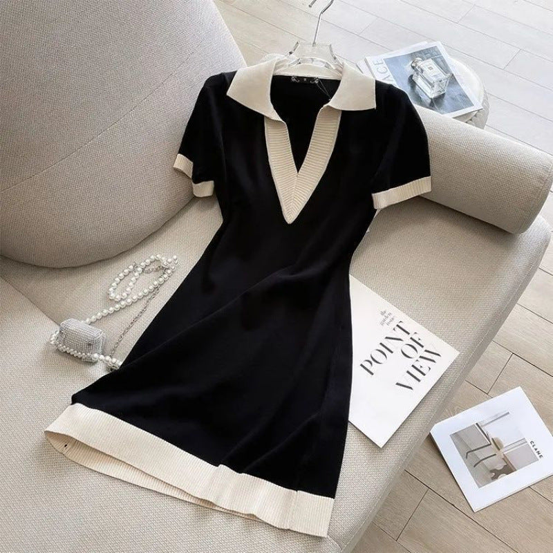 Flavender 2025 Summer POLO Collar Short-Sleeved Knitted Dress Straight Loose V-Neck T-Shirt Dress French Niche DJPT