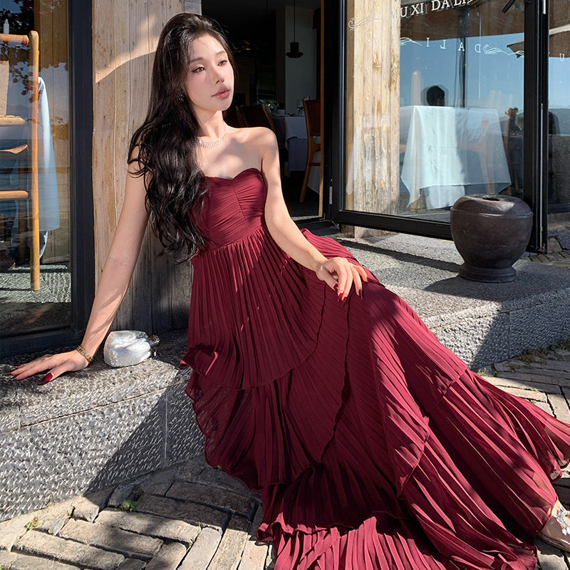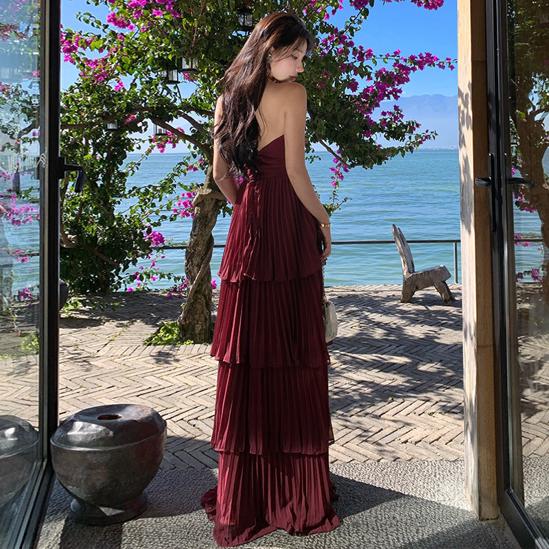 French Folding Temperament Light Windy Beach Thoracic Cake Dress Press Folds High-End Feel Dress Dress