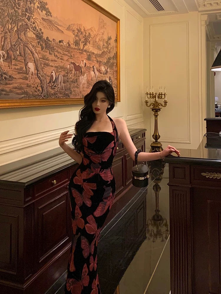 French Sheath Halter Floral Prom Dresses Birthday Outfits Evening Gown SD1041