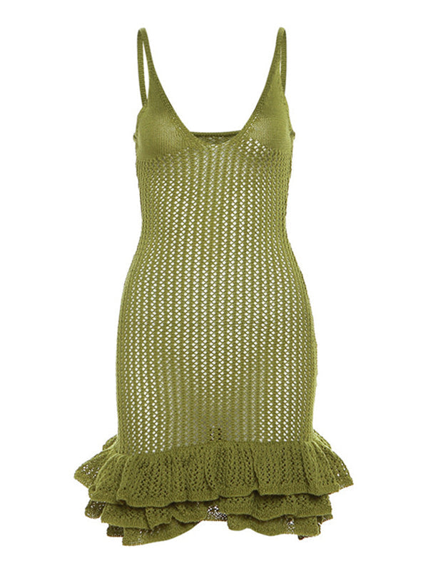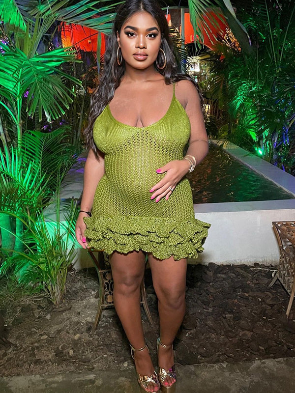 Green Sheer Crochet Hollow Out Ruffle Falbala Cami V-neck Cute Maternity Photoshoot Baby Shower Mini Dress Maternity
