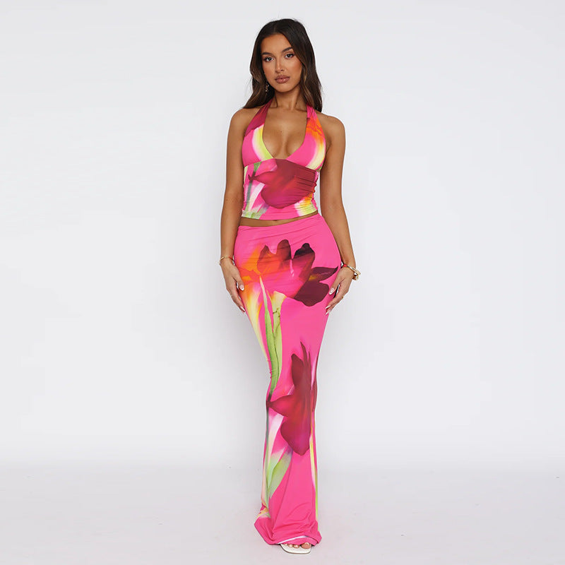 Hanging Neck Print Umbilled Blouse 2025 Summer New Tight-Up Bag Hip Skirt Suit Woman DJPT