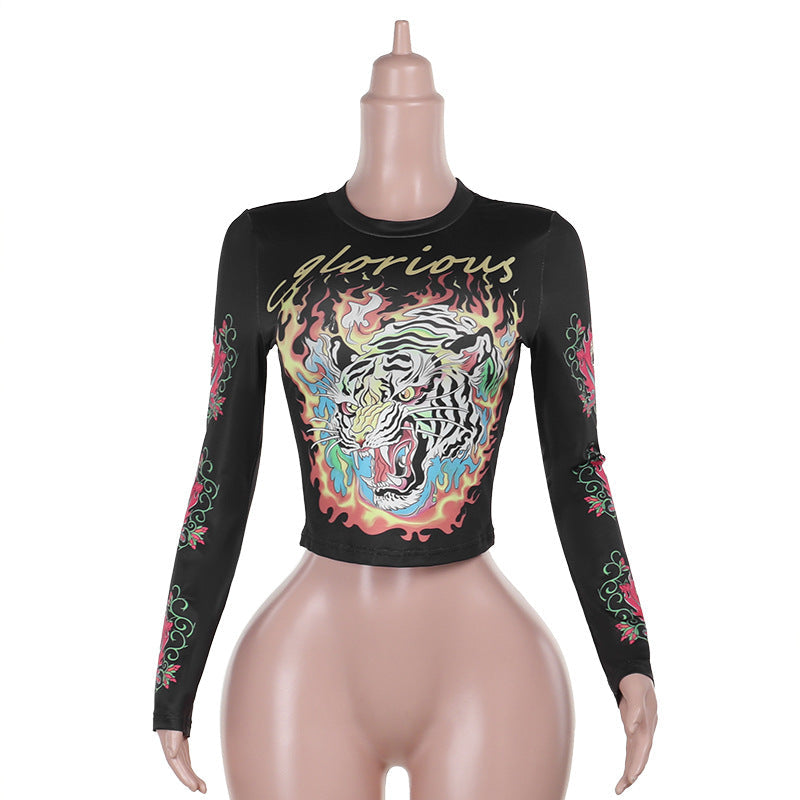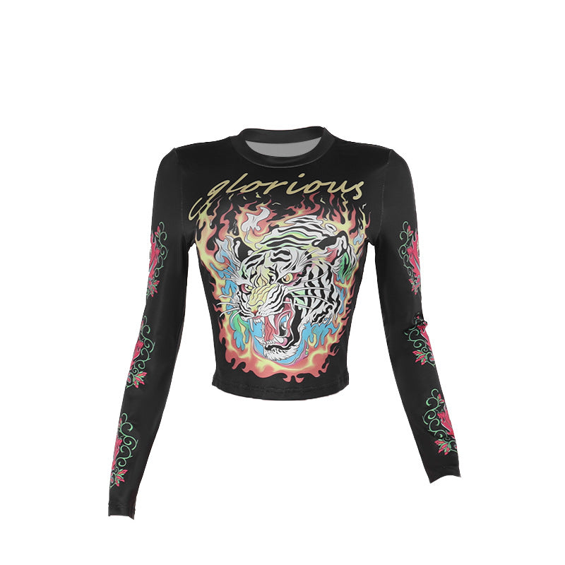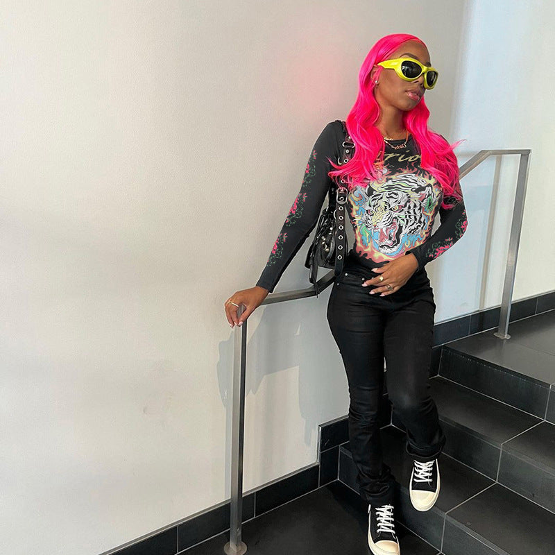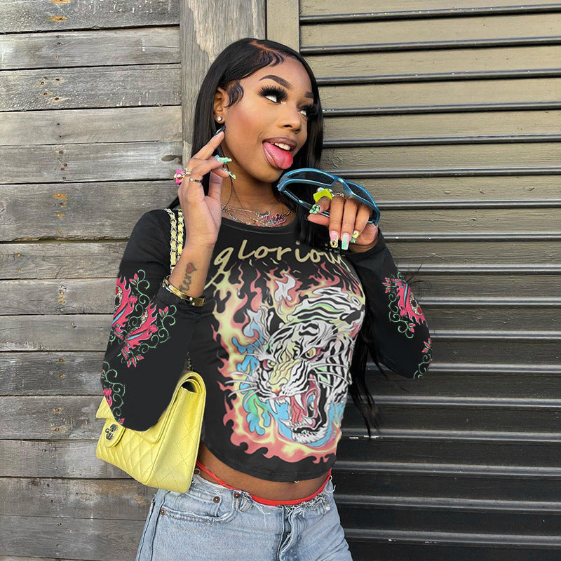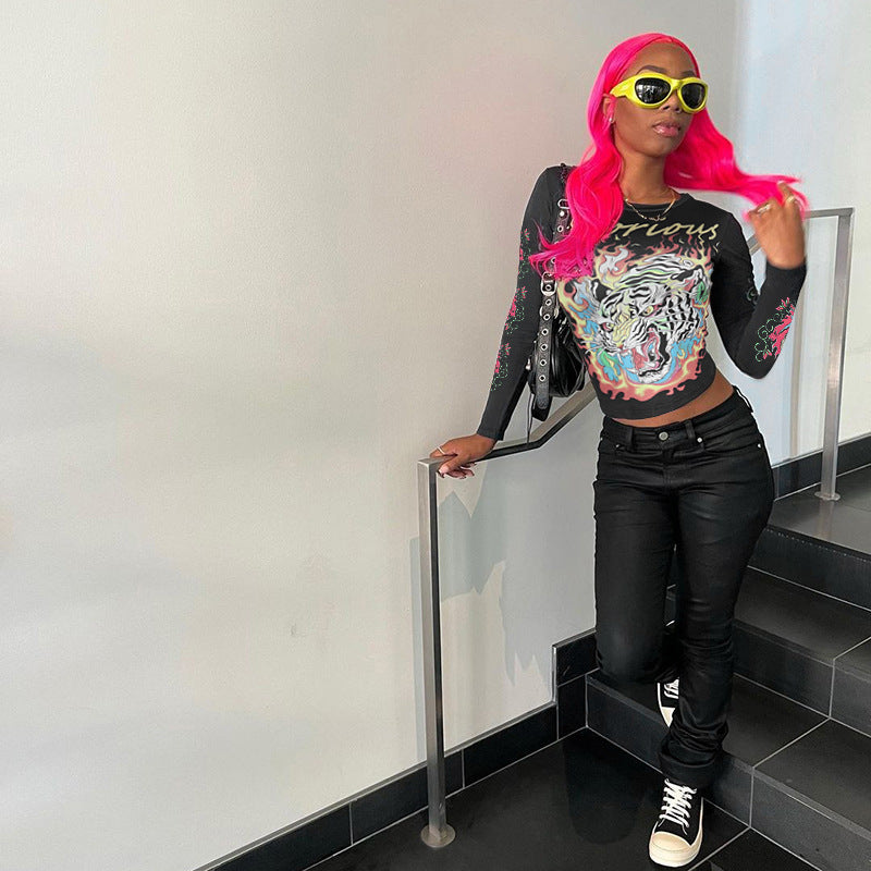 Long-Sleeved Cool Street Print T-Shirt Girl Personality Trendy Street With Short Sleeve Top DJPT