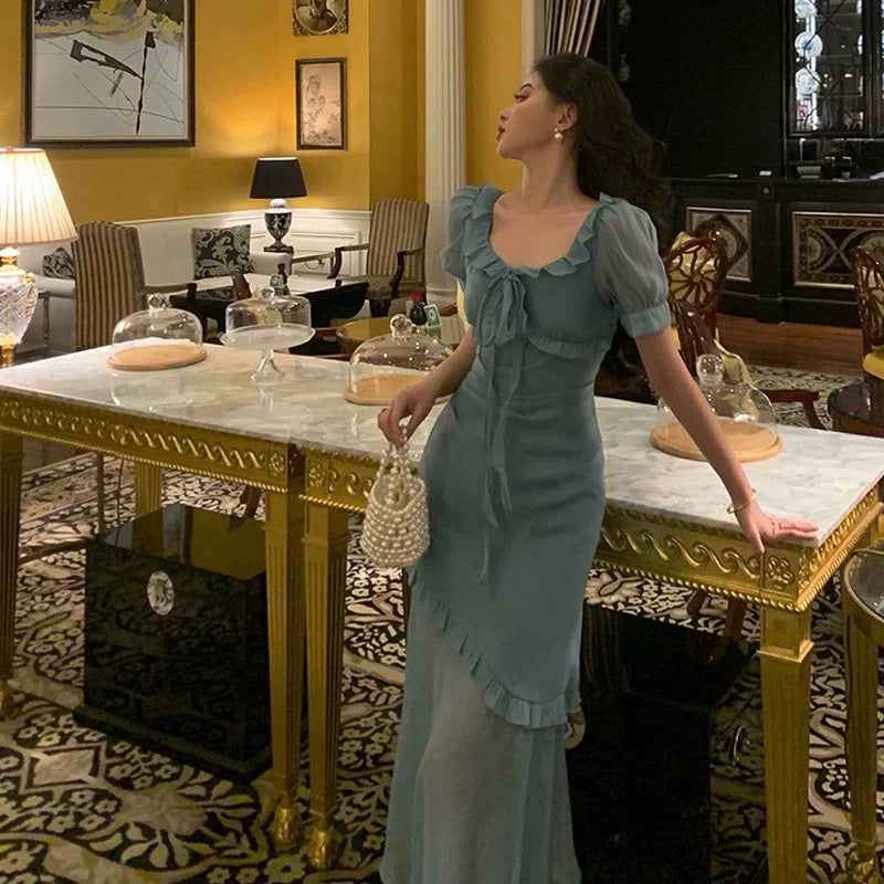 Mermaid Square Neckline Short Sleeves Blue Chiffon Prom Dresses Birthday Outfits Evening Gown SD993
