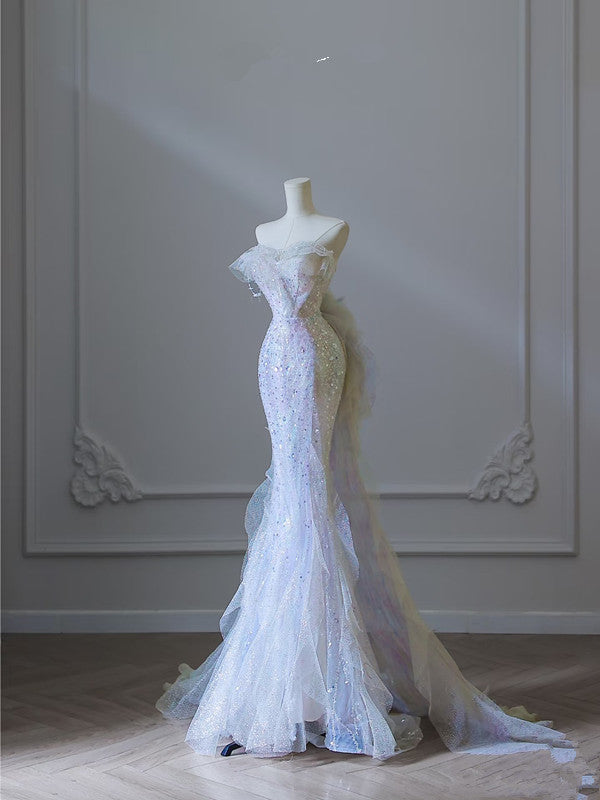 Mermaid Strapless Tulle Flowers Evening Dress Long Prom Dresses SD1652