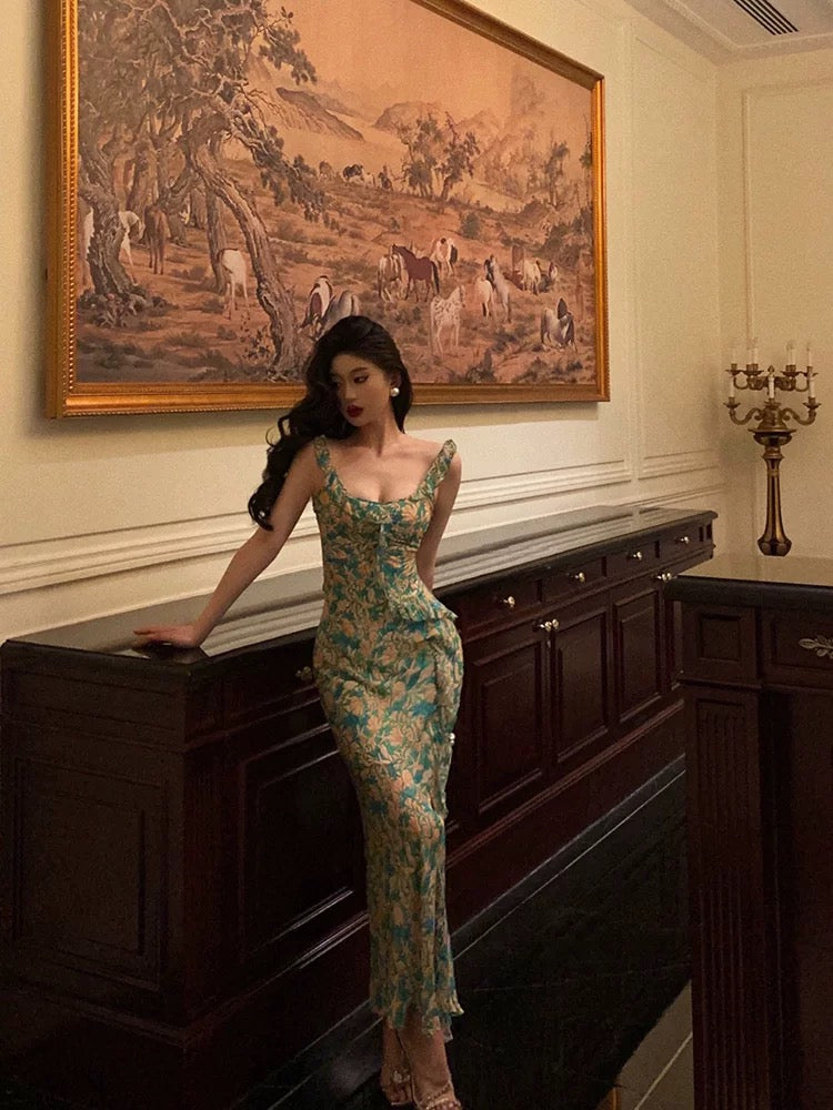 Mermaid Straps Floral Green Chiffon Prom Dresses Birthday Outfits Evening Gown SD943