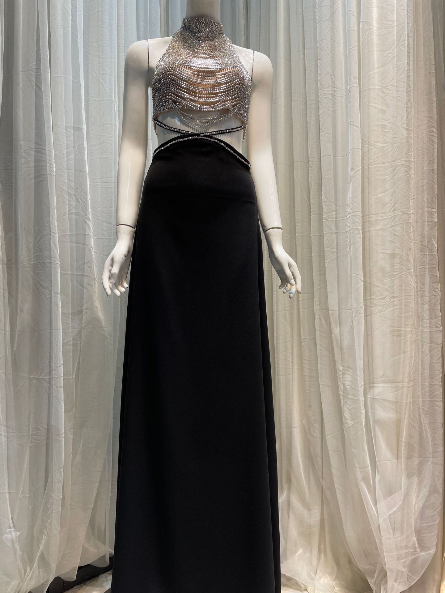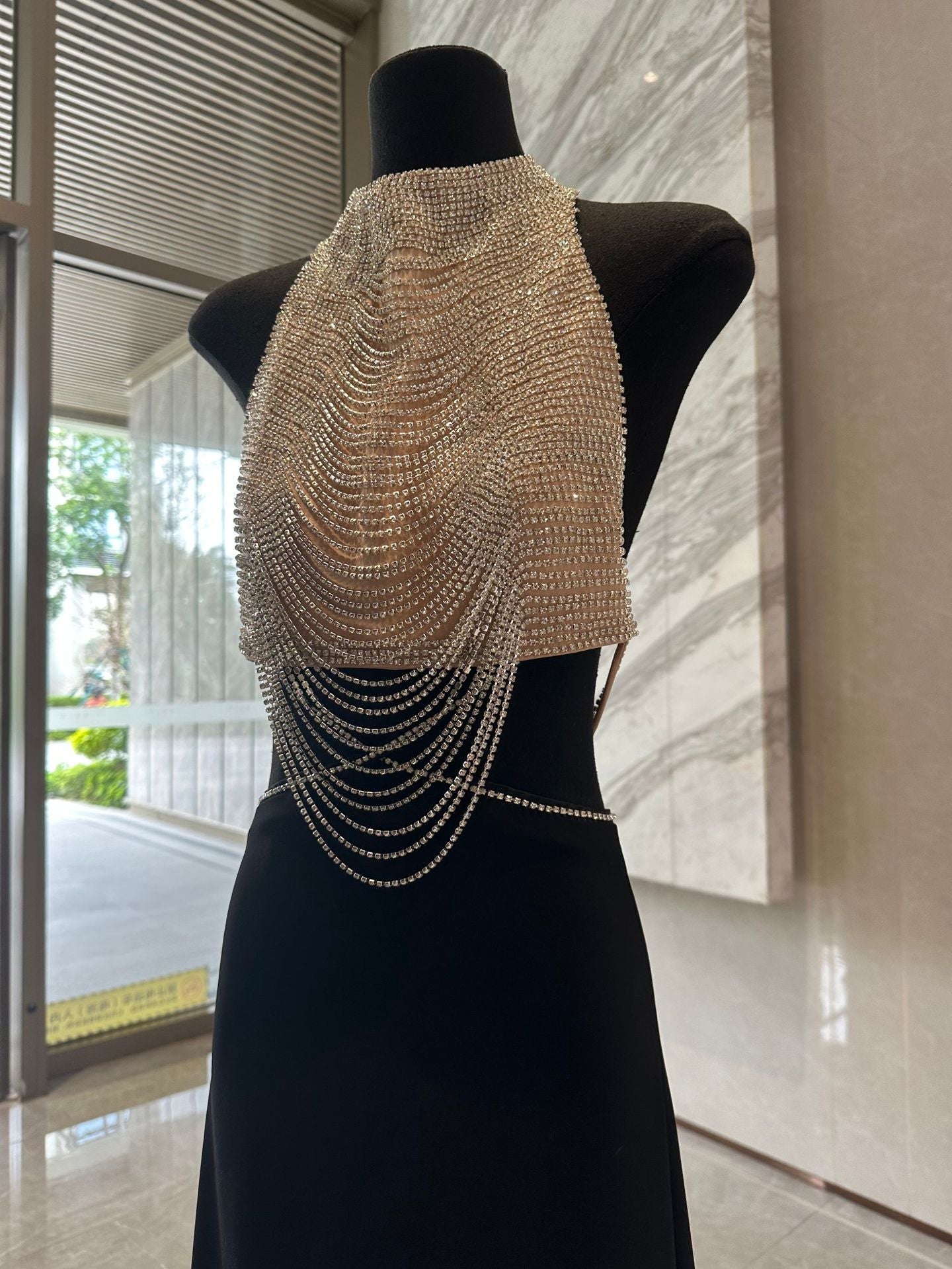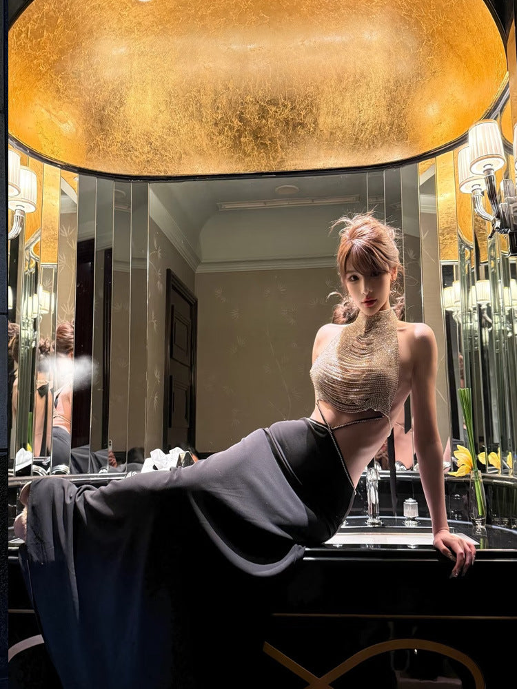 Neck Dress Female Famous Temperament Heavy Industry Diamond Bag Fishtail Dress Sexy Hollow Bare Waist Birthday Dress