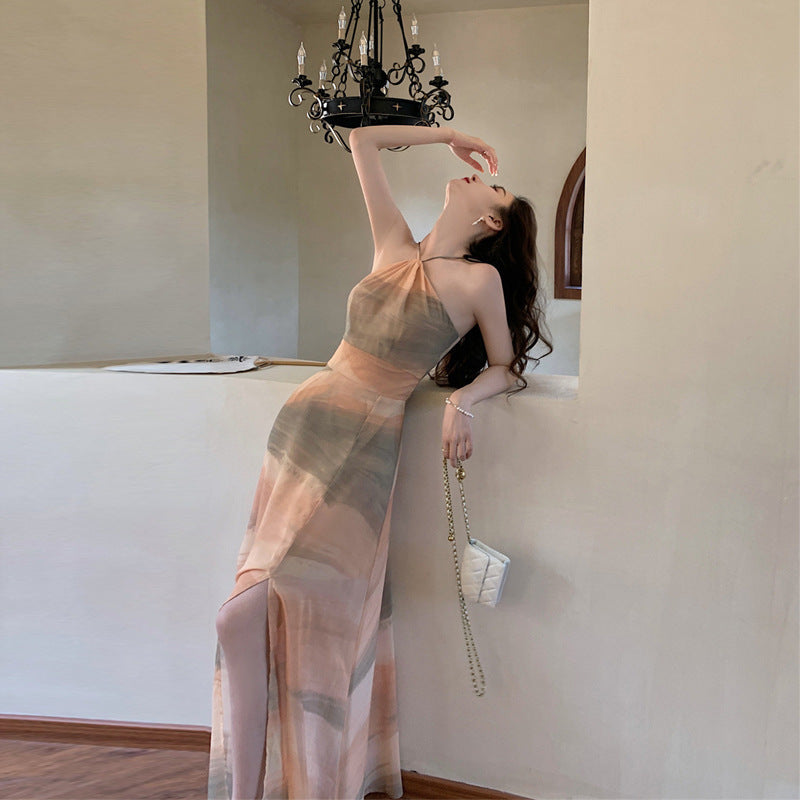 Neck Print Sling Dress Spring Summer 2024 New Women's Chiffon Open Fork Back Holiday Dress