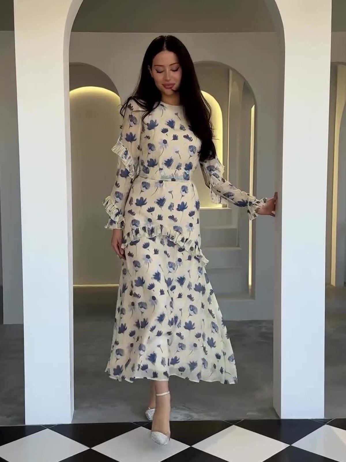 New Gentle Wind Crush Floral Dress Women's Round Collar Long-Sleeved Leaf-Side Dress