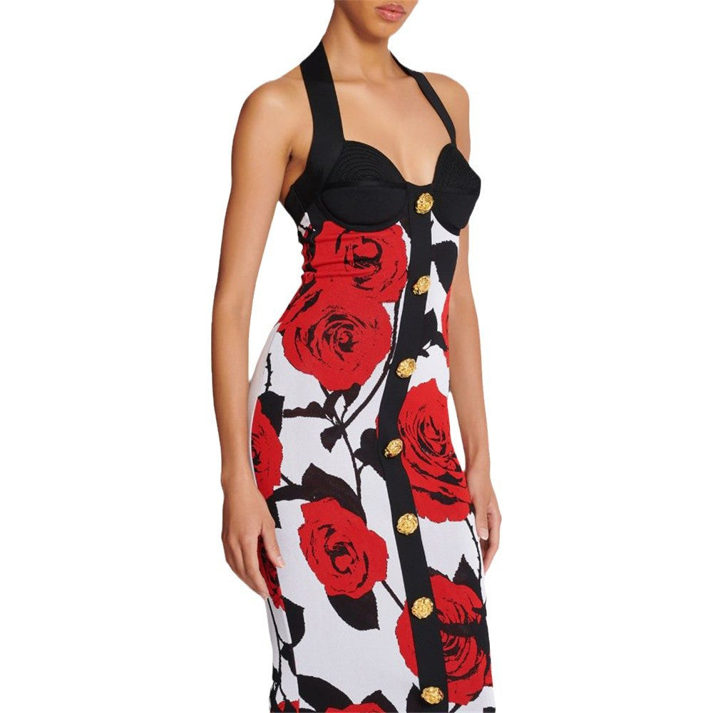 New Small Fragrant Rose Knitted Banda Dress Sexy Hanging Neck Gold Buckle Elastic Dress