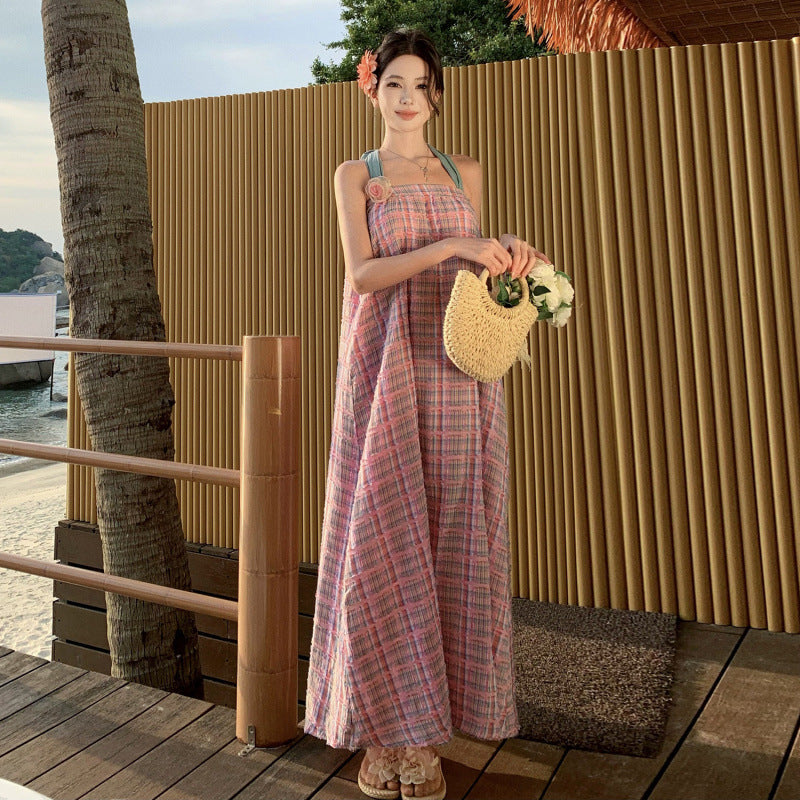 New Thai Sanya Beach Holiday Loose Retro Lattice Long Hanging Neck Tset Dress Summer
