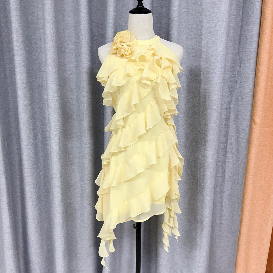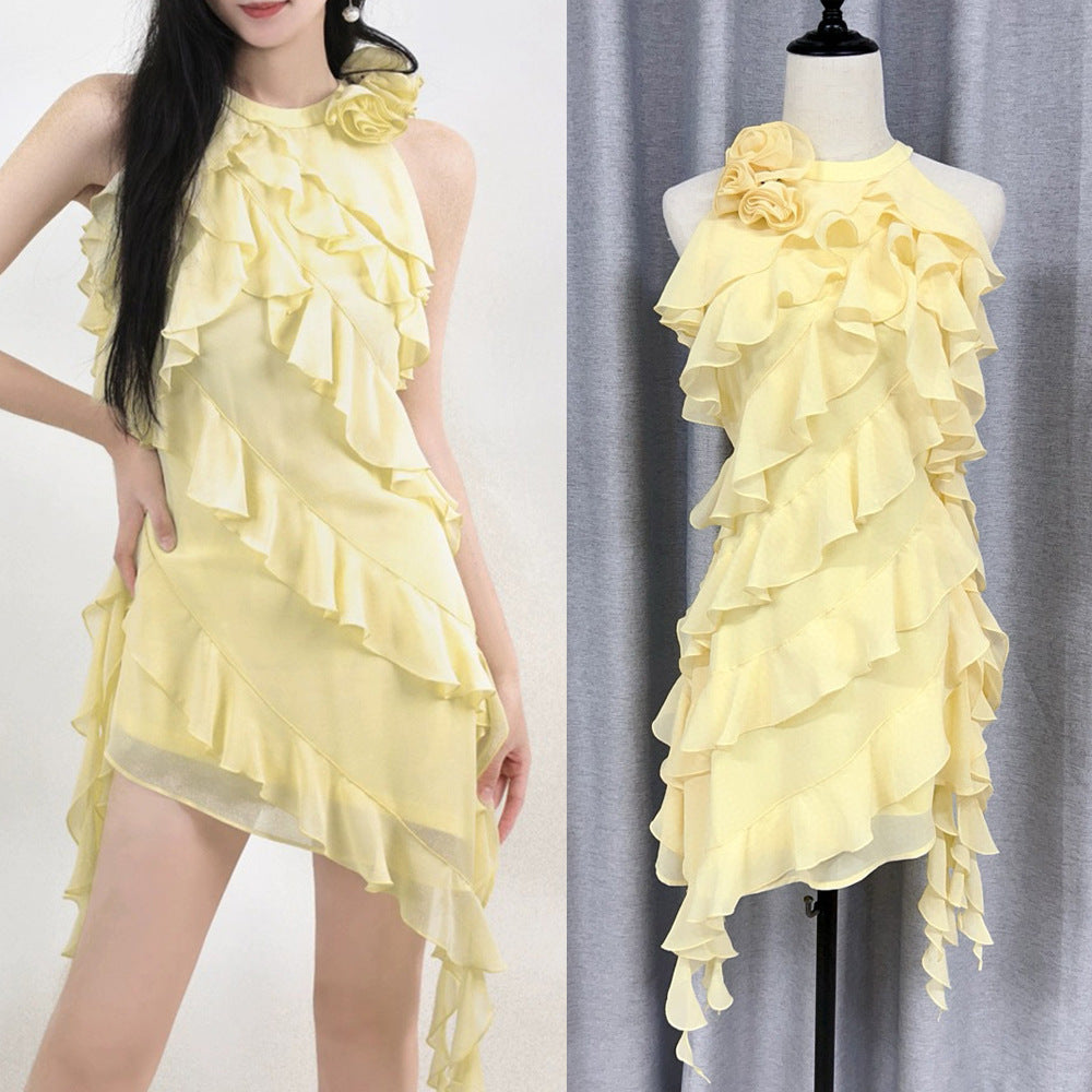 New Yellow Lotus Leaf Side Ribbon Hanging Neck Dress Flexible Girl Flower Vest