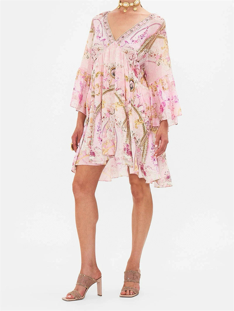 Niche Silk Silky Retro Court Print V Collar Horn Sleeves Loose Waist Small Flowing Dress
