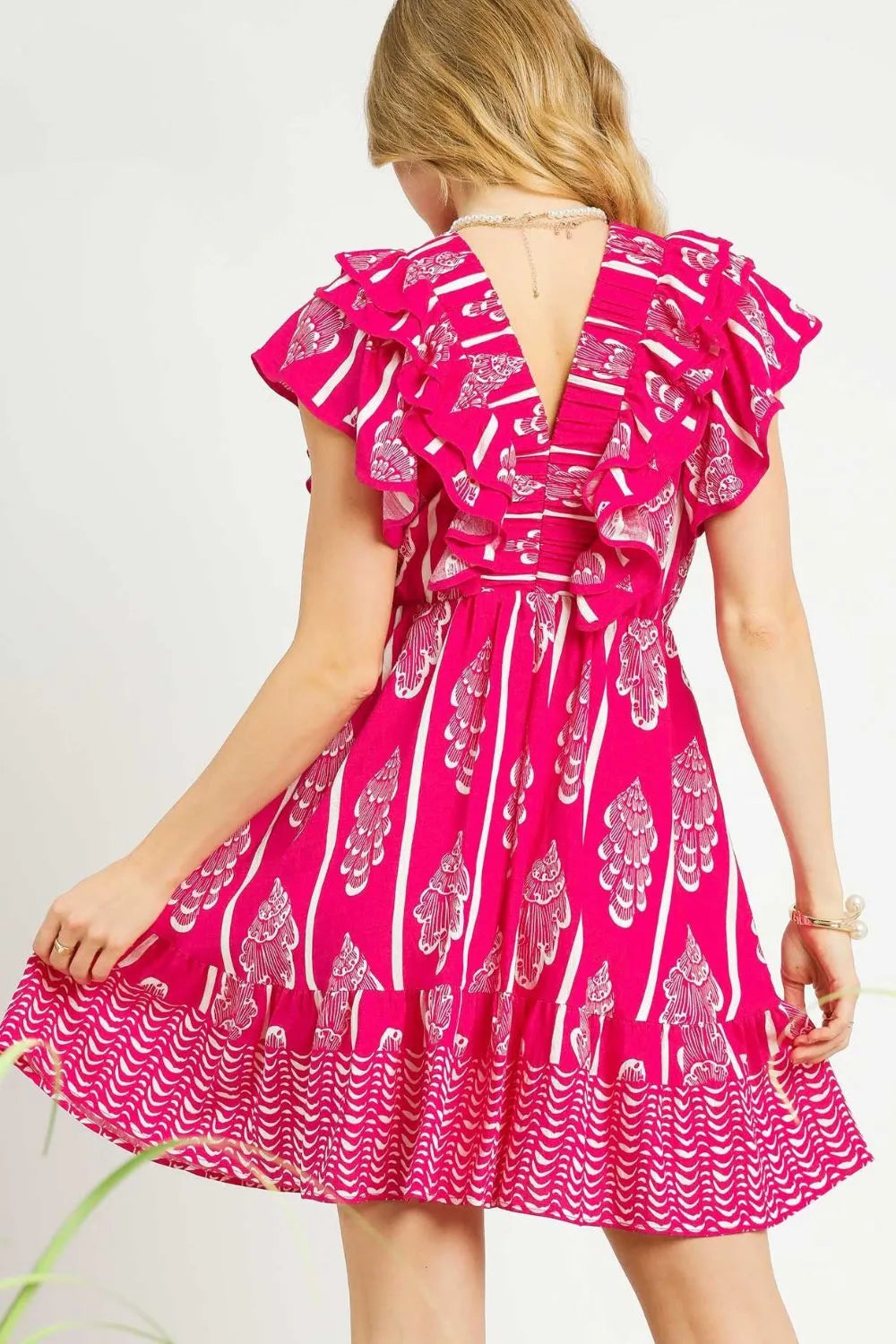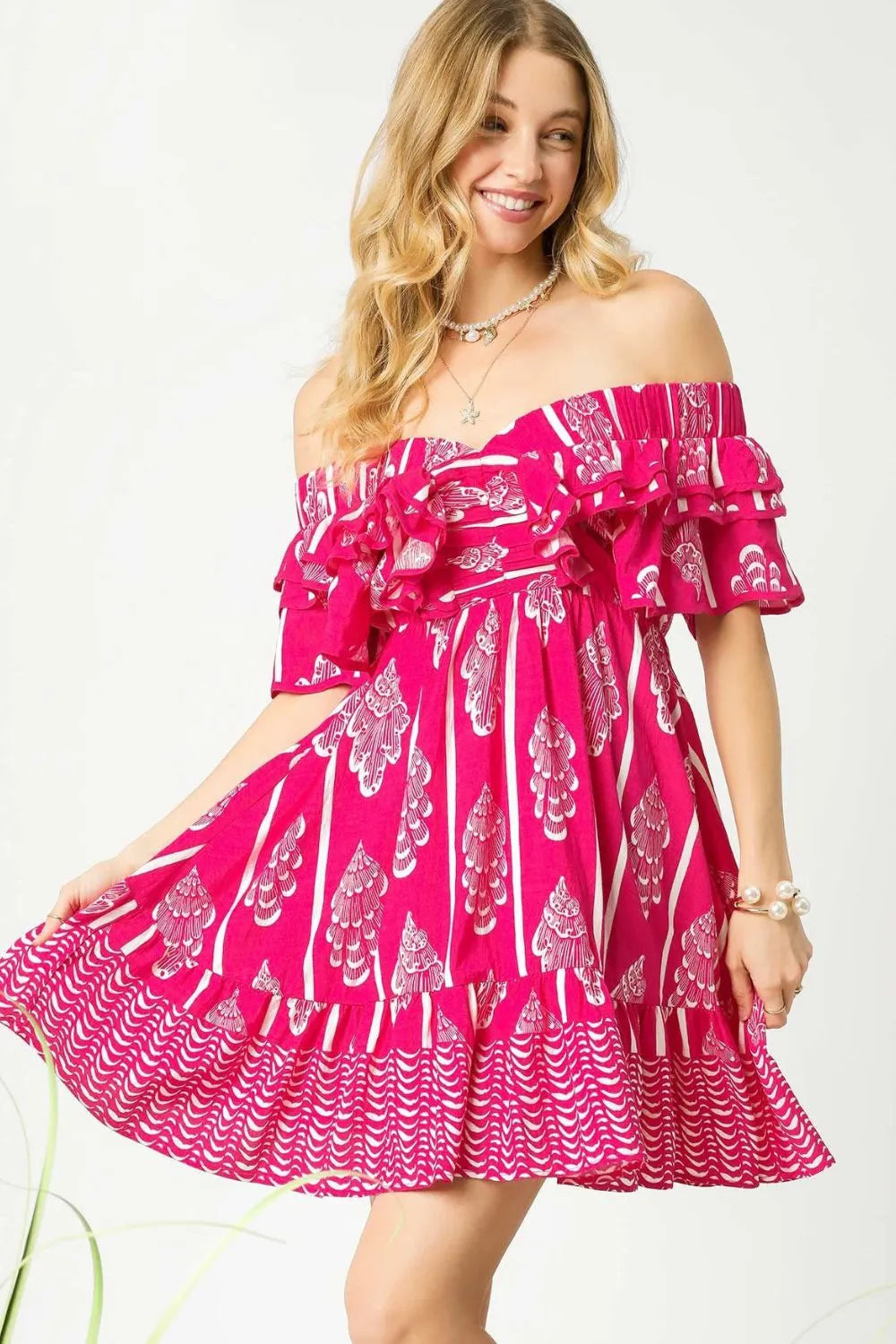 This stunning bohemian-inspired mini dress features an eye-catching off-shoulder design with elastic smocked neckline for comfortable fit. The vibrant pink base showcases intricate paisley and floral prints in white and complementary colors. Made from lightweight, breathable fabric perfect for warm weather. The dress includes charming ruffled short sleeves, an empire waist with adjustable tie belt, and a flowy A-line silhouette that flatters all body types. The mini length and relaxed fit make it ideal for casual outings, beach vacations, or summer festivals. Easy care fabric with excellent drape and movement.