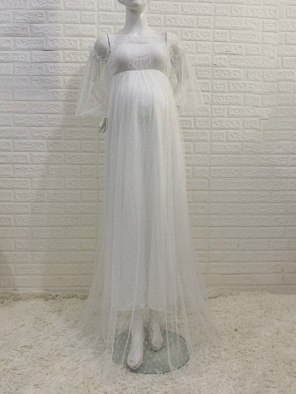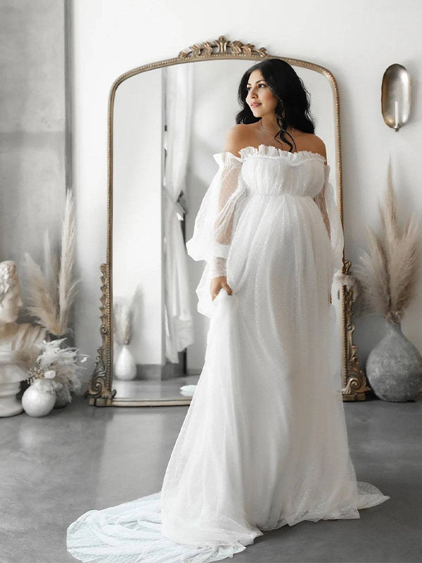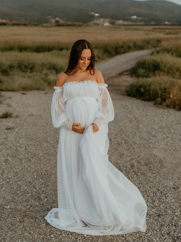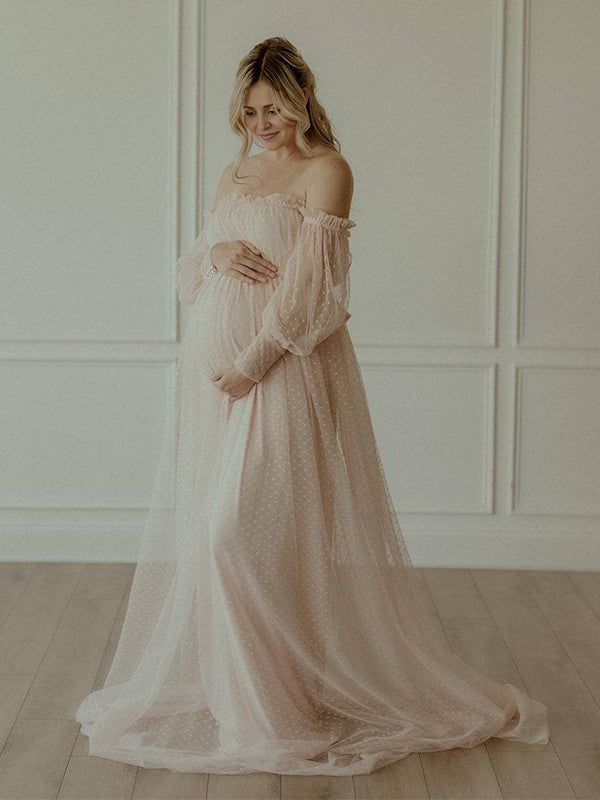 Off Shoulder Tulle Polka Dot Elegant Photoshoot Baby Shower Maternity Maxi Dress Maternity