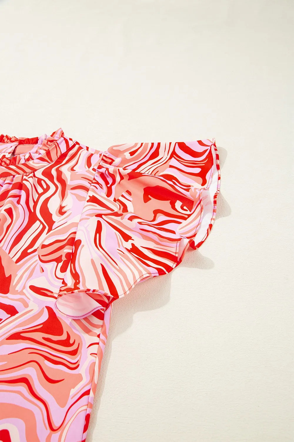 Print Ruffled Short Sleeve Mock Neck Blouse DJPT