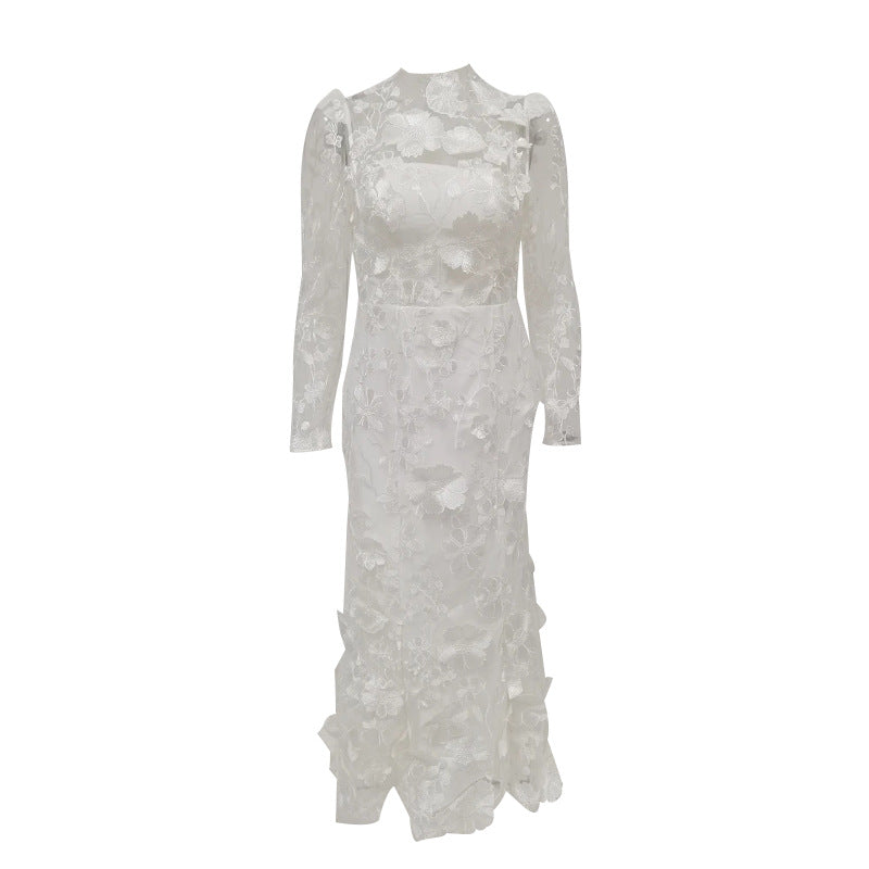 Retro-Colored Floral Embroidery Design For The Summer Of 2025 New Round-Neck Long-Sleeved Heavyweight High-Waisted Dress Woman