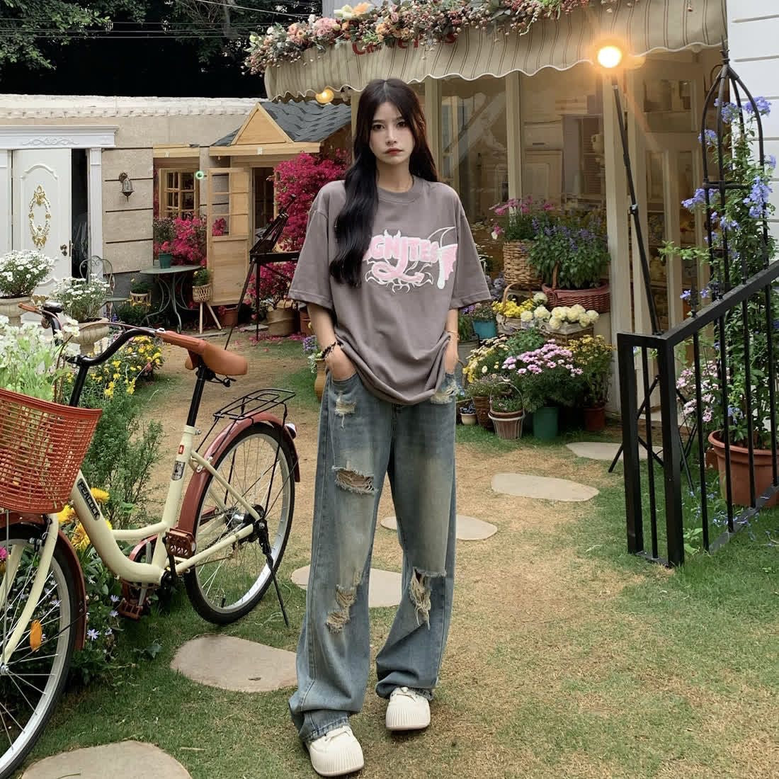 Ripped Jeans Women High-Rise Straights Loose Thin Design High Street Vibe Broad Leg Trousers DJPT