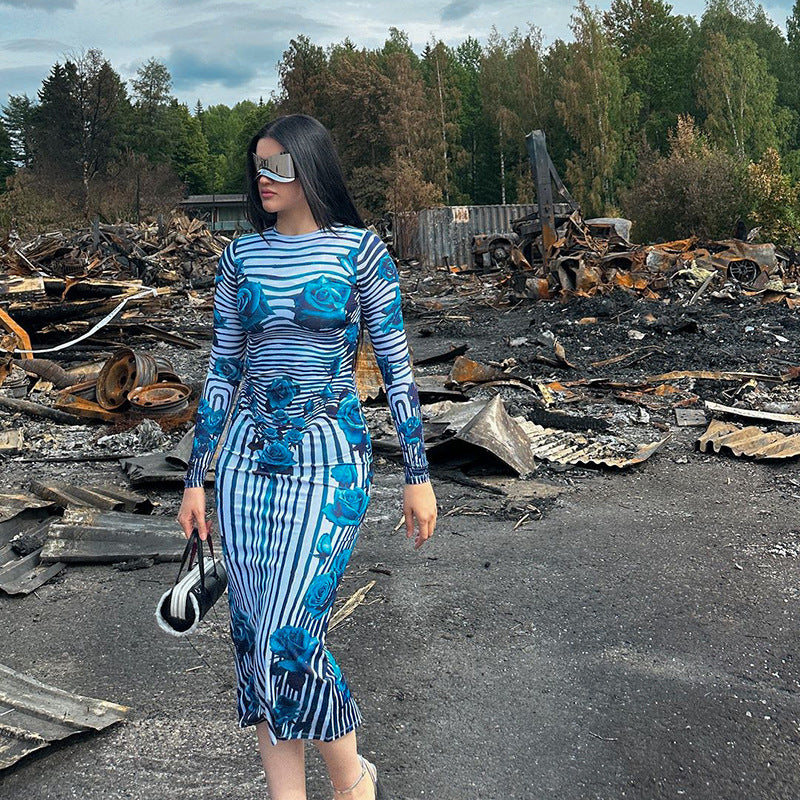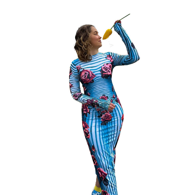 Rose-Print Striped Long-Sleeved Dress 2025 Summer New Temperament-Packed And Hip Dress Girl DJPT