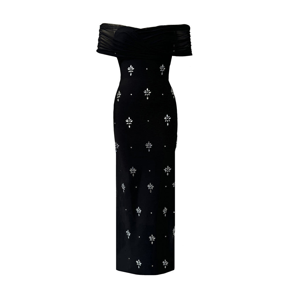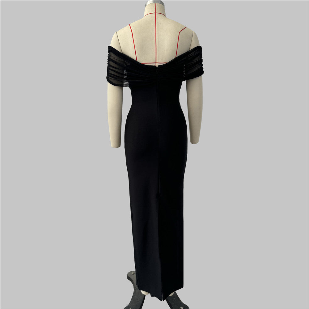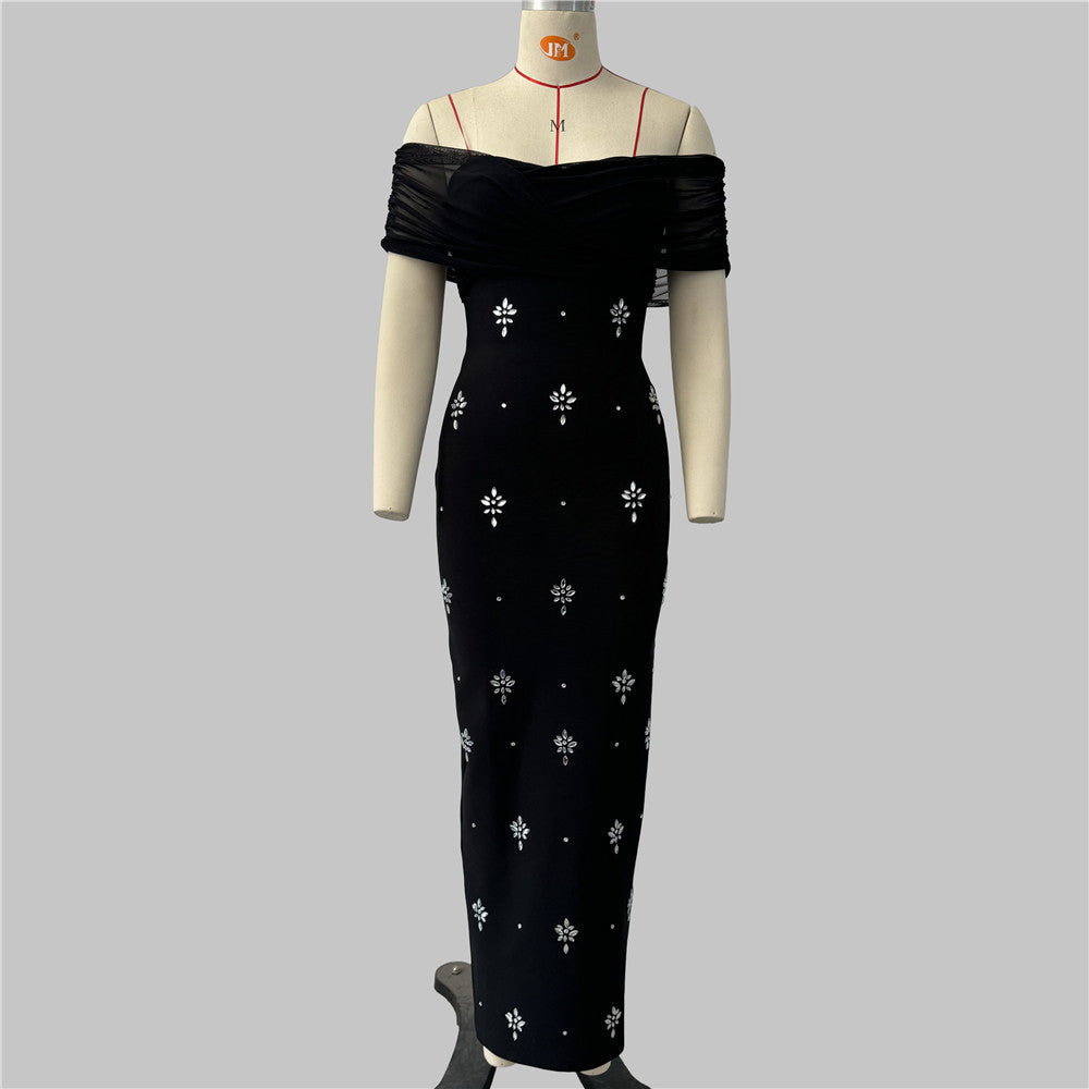 Sexy Folded Mesh Drill Splicing Word Shoulder Banded Skirt Party Evening Dress Skirt