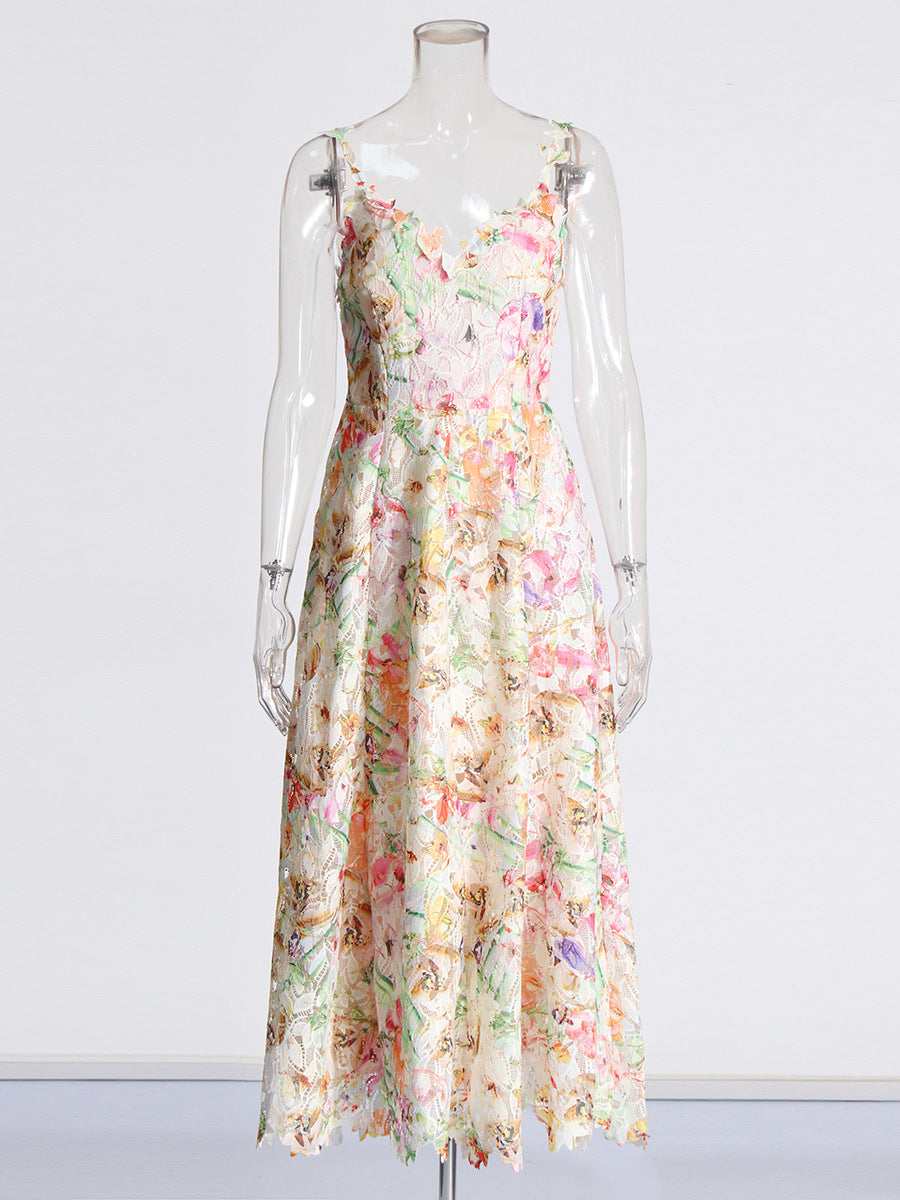 Sexy Hottie Style 2025 Summer New Lace Embroidery Print Waist Long Sling Dress Women's Dress