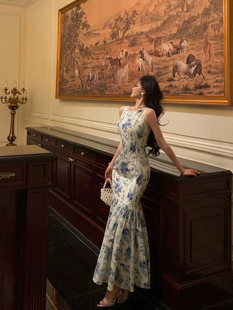 Sheath Boat Sleeveless Blue Floral Ruffle Long Prom Dresses Birthday Outfits SD616