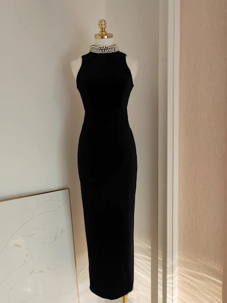 Sheath High Neckline Black Travel Vacation Dresses Velvet Birthday Dress SD326
