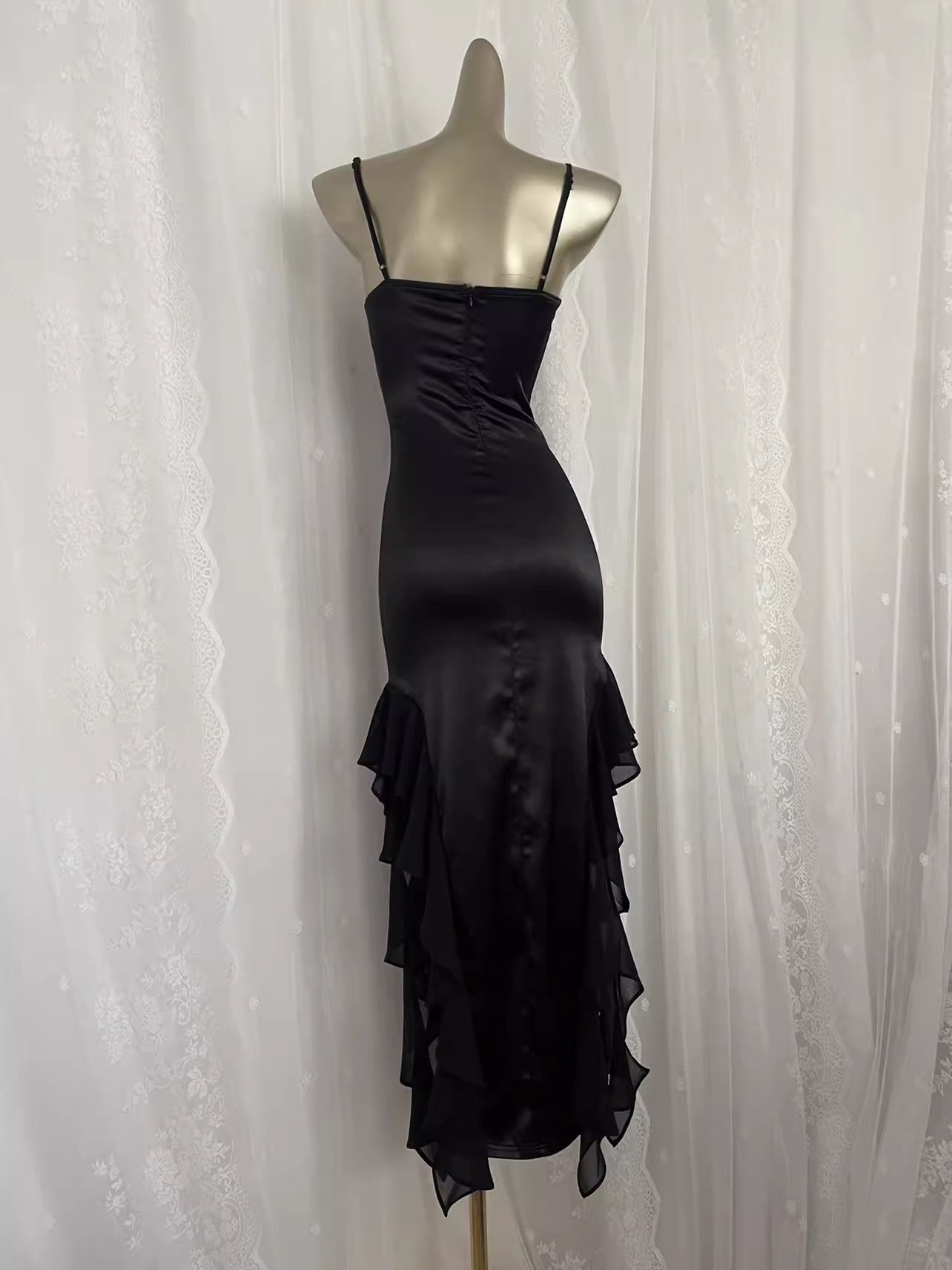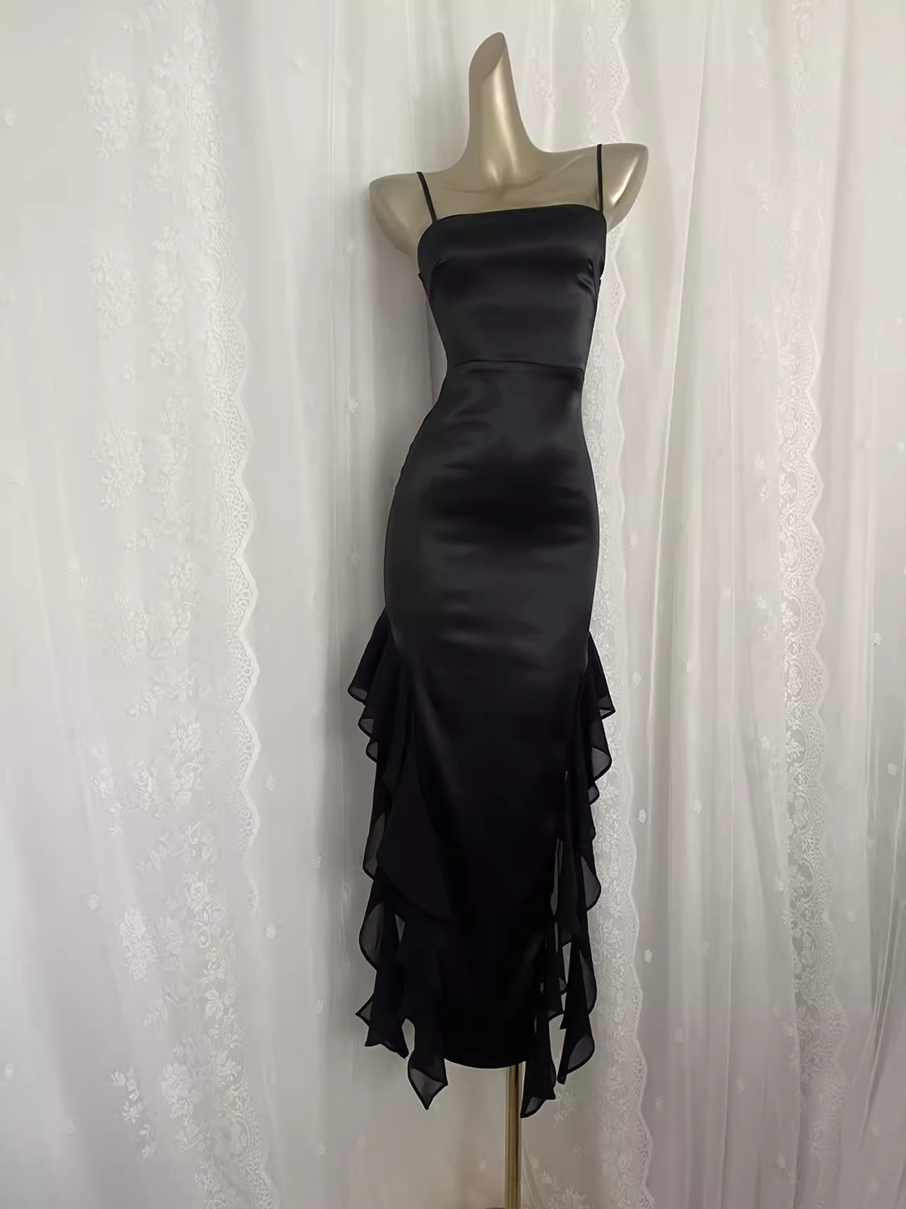 Sheath Spaghetti Straps Black Satin Vacation Beach Dress Long Birthday Dresses SD006