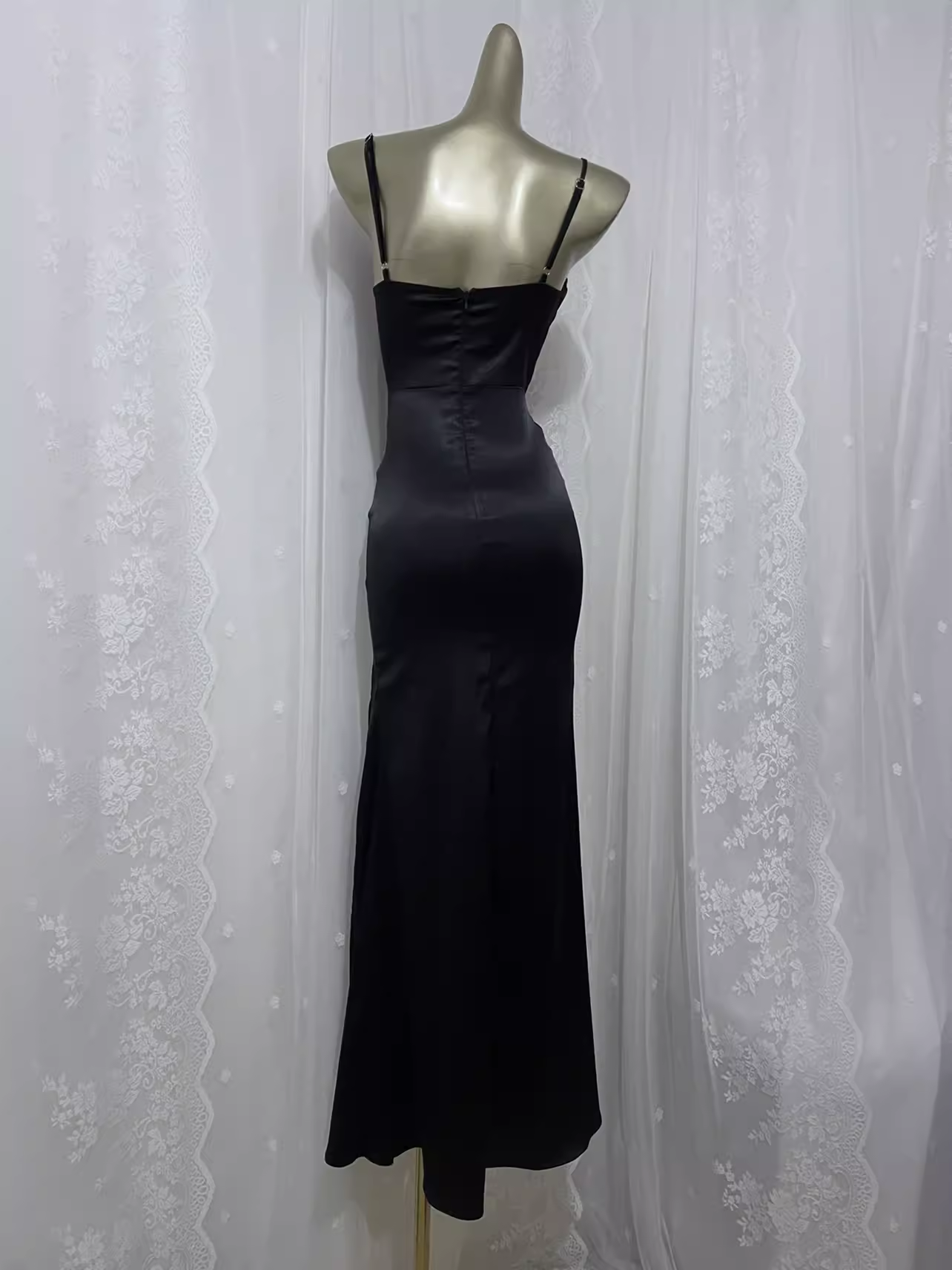 Sheath Spaghetti Straps Black Vacation Dress Satin Birthday Dresses SD0025