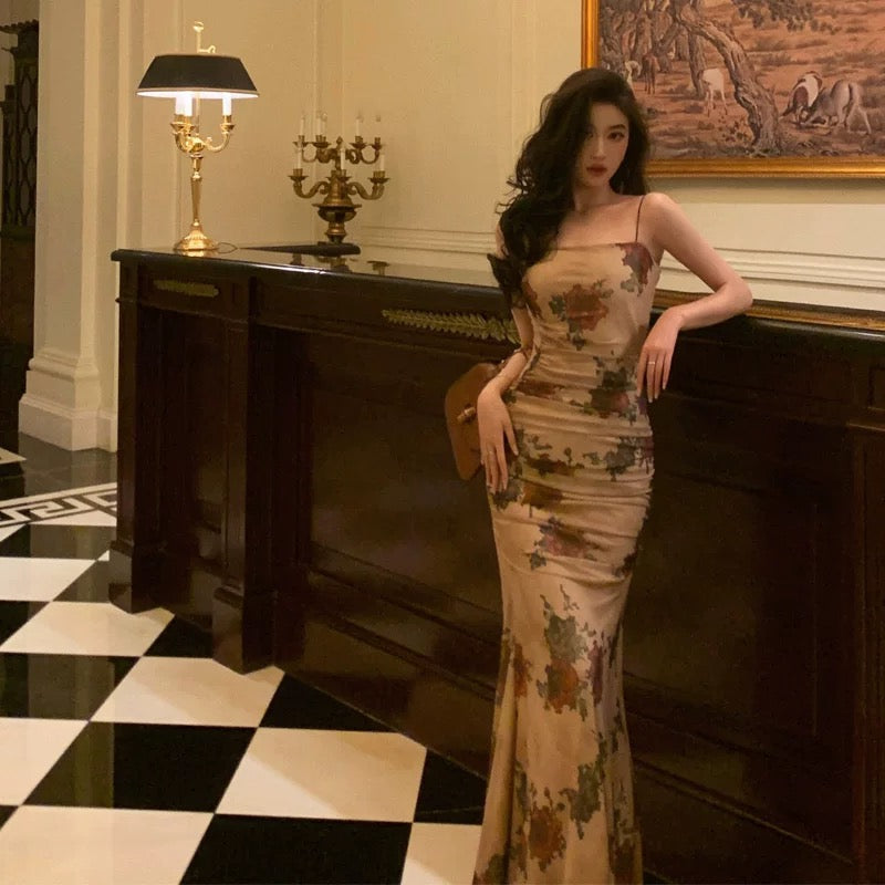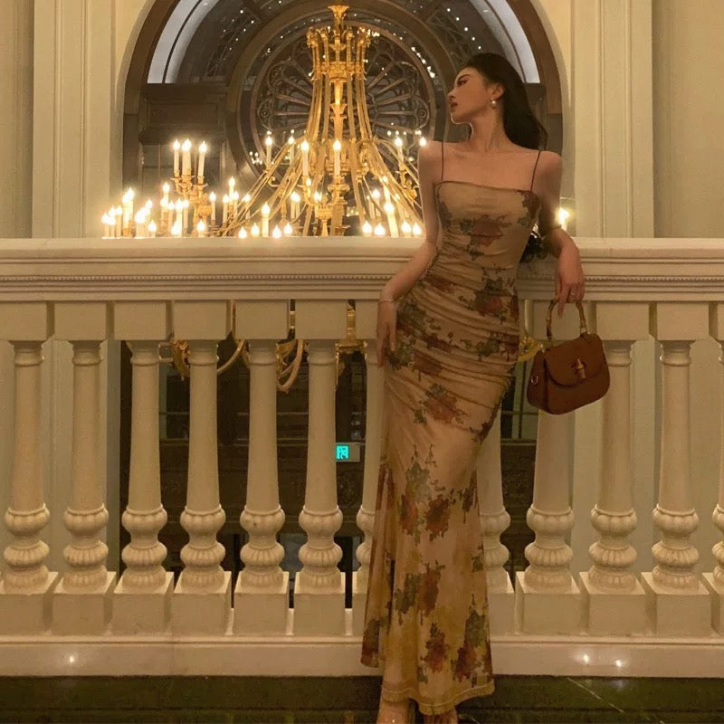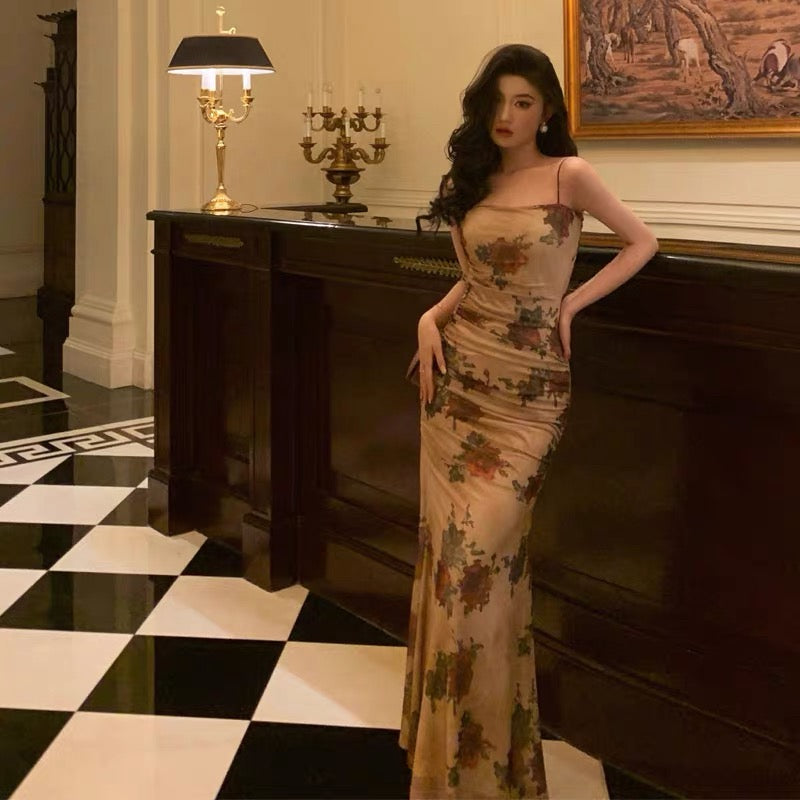 Sheath Spaghetti Straps Champagne Floral Prom Dresses Birthday Outfits Evening Gown SD922