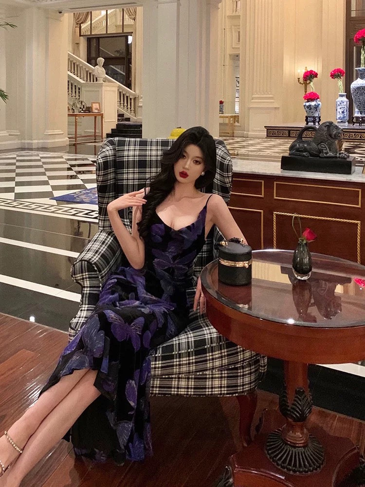 Sheath Spaghetti Straps Floral Grape Butterfly Fold Long Prom Dresses Birthday Outfits SD612