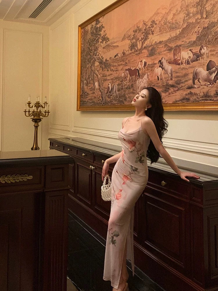 Sheath Spaghetti Straps Floral Pink Ankle Length Prom Dresses Birthday Outfits SD597
