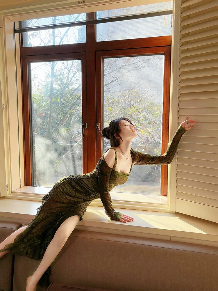 Sheath Spaghetti Straps Green Ruffles Long Evening Dress Lace Prom Dresses SD2819