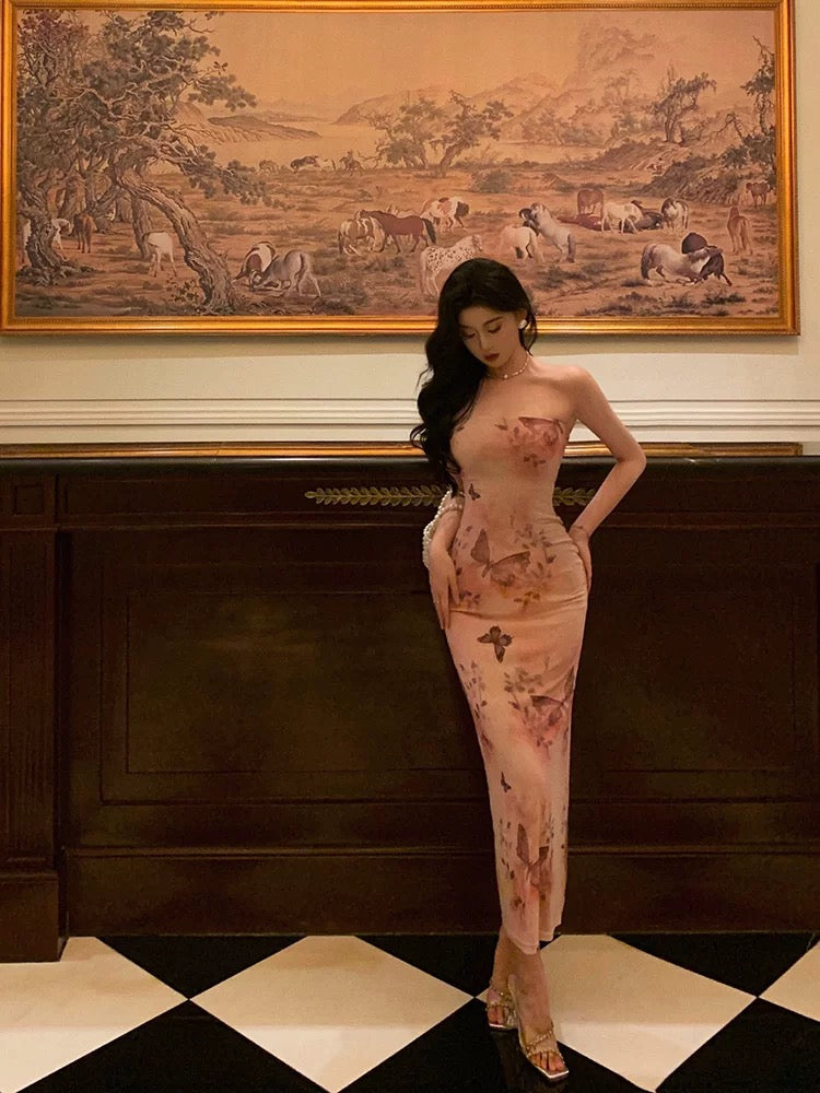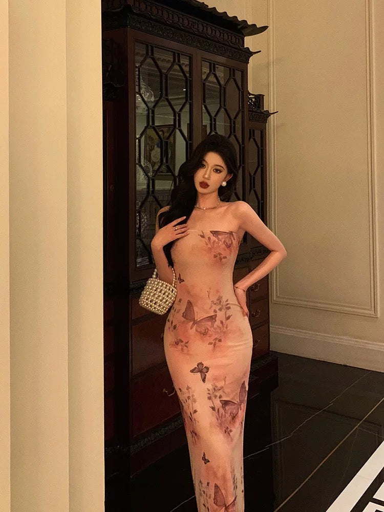 Sheath Strapless Pink Floral Date Night Dress Prom Dresses Birthday Party Outfit SD906