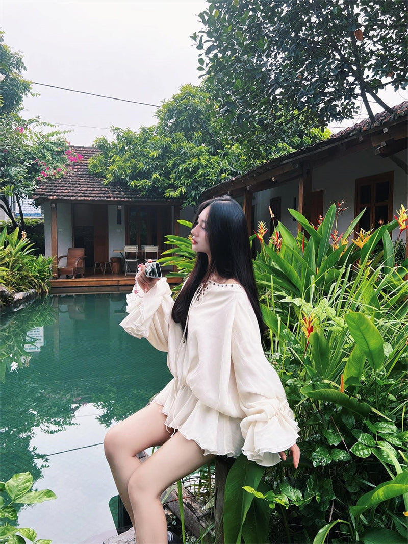 Shoulder Strapped With Long-Sleeved Dress Women's Early Autumn French White Short Dress Design Feel Waist Temperament A-Character Skirt