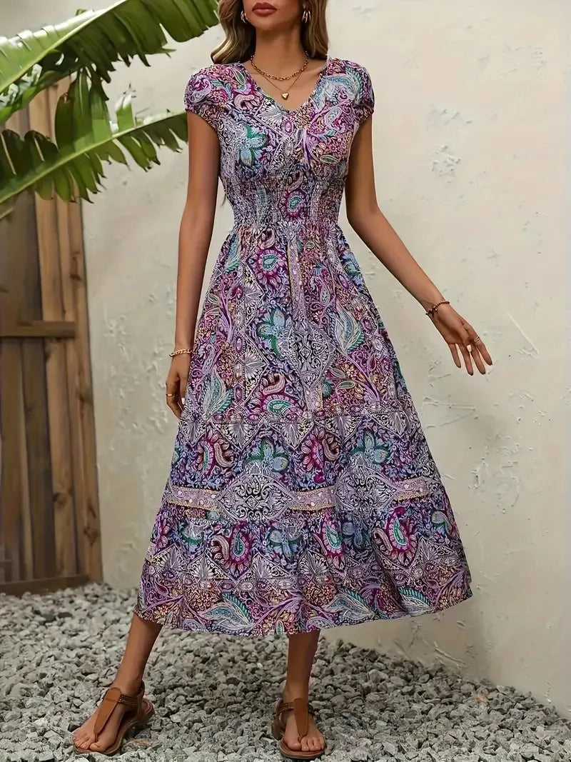 Size Printed V-Neck Short Sleeve Midi Dress DJPT