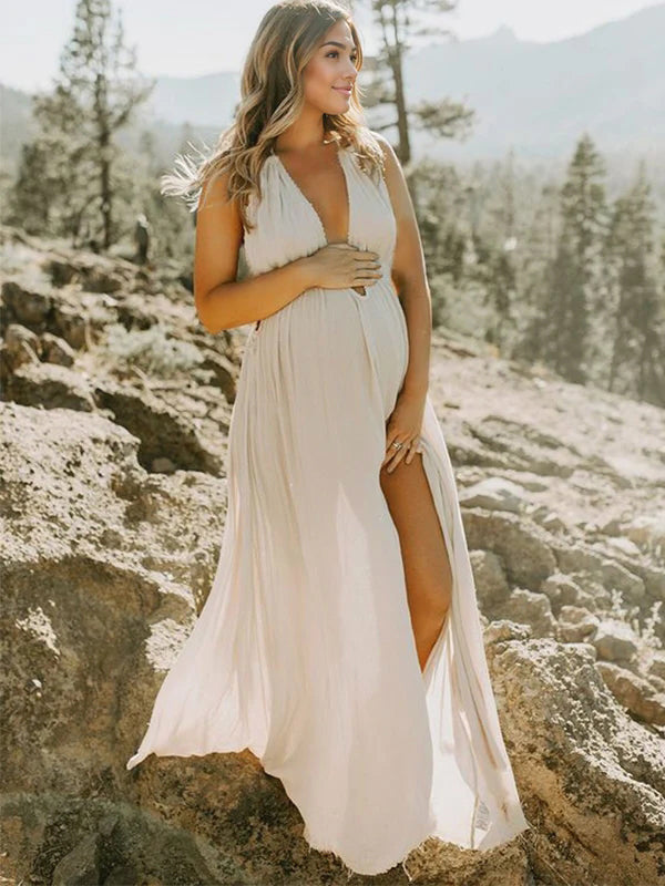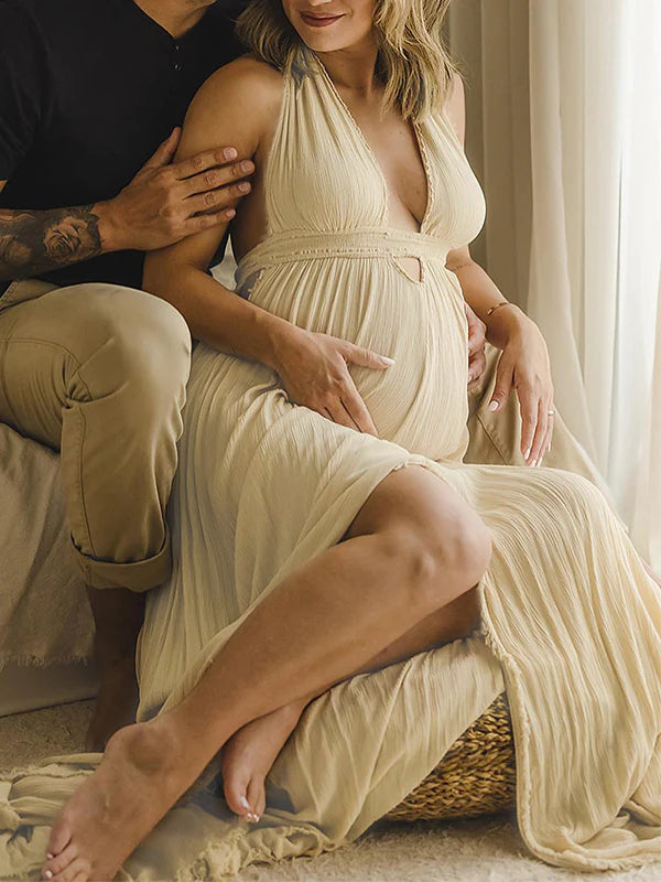 Solid Color Cut Out V-Neck Side Slit Backless Tassel Halter Neck Vacation Photoshoot Maternity Maxi Dress Maternity