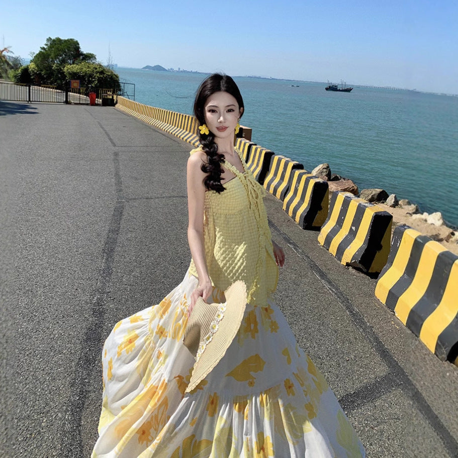Style Beach Skirt Casual Temperament Hanging Neck Top Two Sets + Print Long Skirt Set
