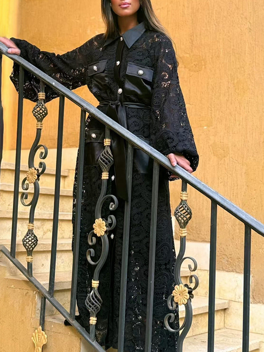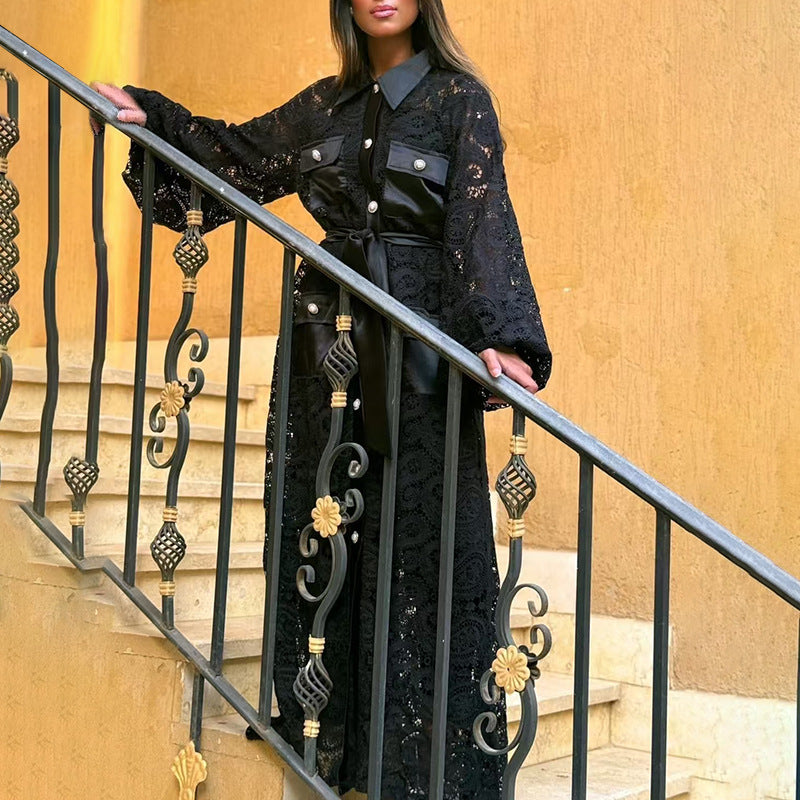 Style Dress 2025 New V-Neck Pocket Splicing Embroidery Hollow High-End Dress Dress Woman