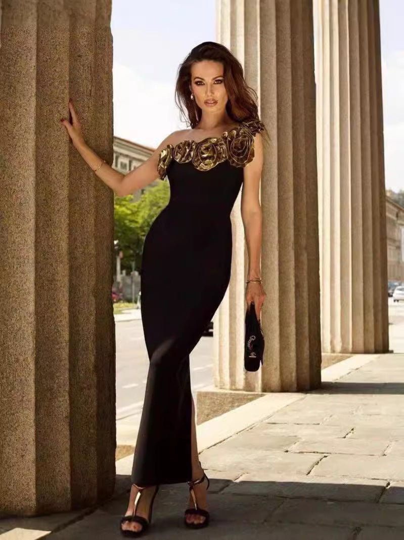 Three-Dimensional Flower Women's Bandage Evening Dress Skinny Temperament Party Party With Hip Dress