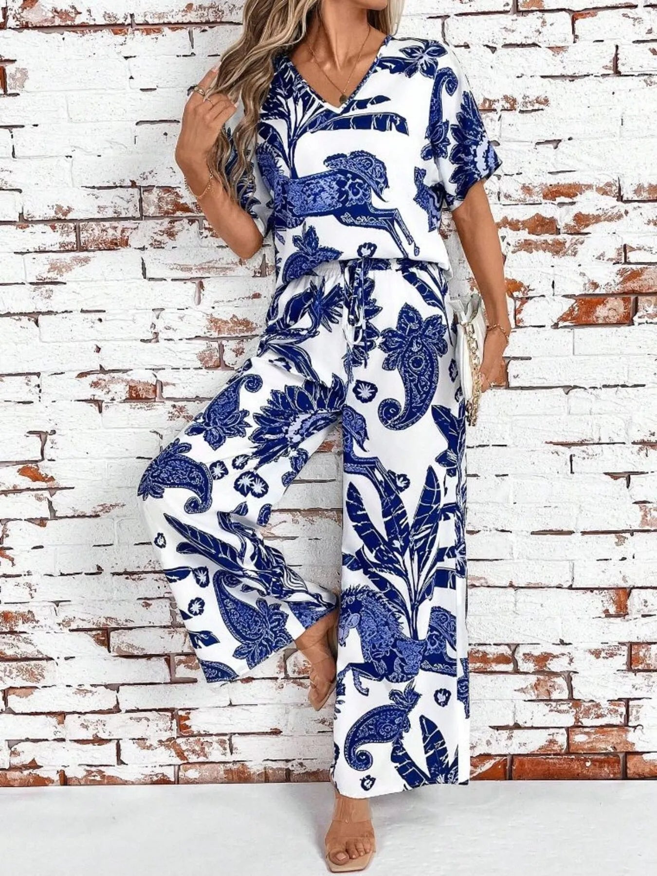 V-Neck Top and Wide Leg Pants Set DJPT