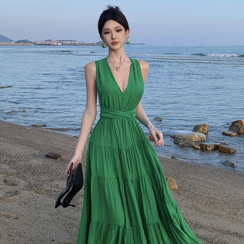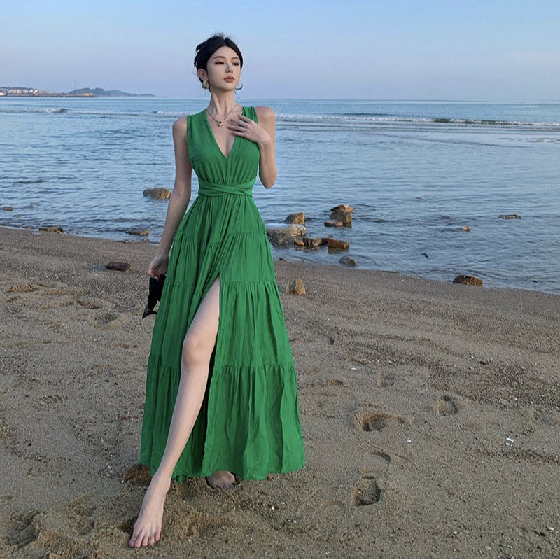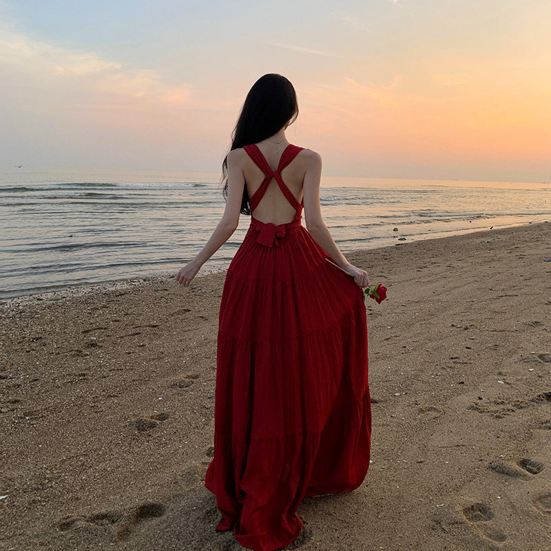 V-Necked With Hanging Neck Dress Female Seaside Holiday Sexy Bare Back Open Fork Showing Lean Long Skirt