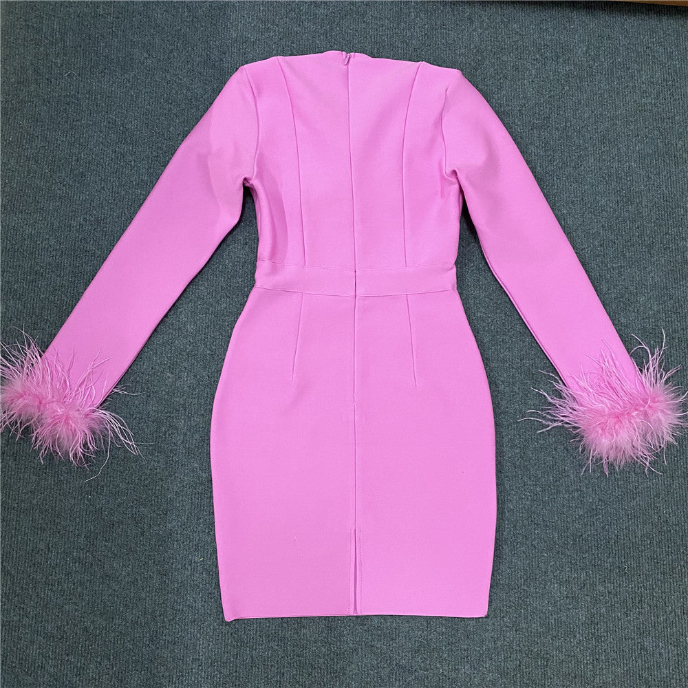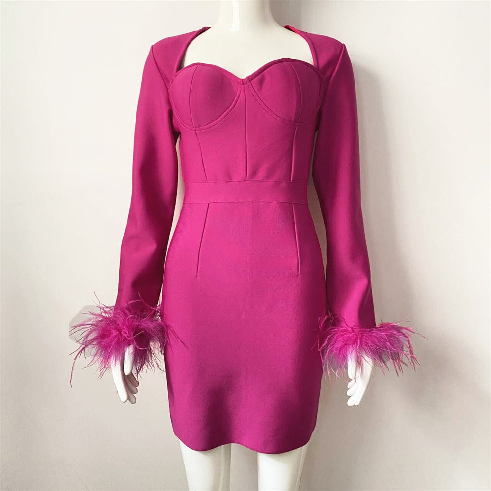 Women's Clothing 2025 Spring New Bandage Dress Elegant Square Collar Feathers Long-Sleeved Dress Dress