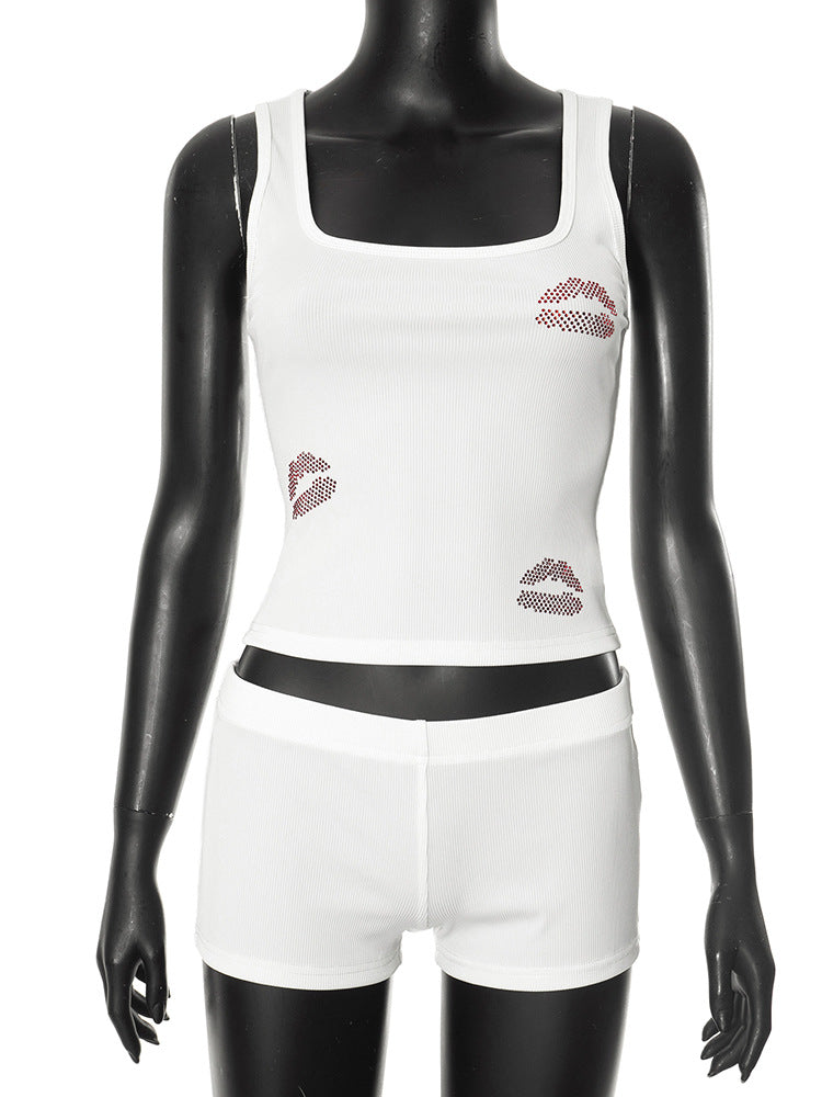 Women's Sleeveless U-Neck Lip Red Hot Drilling Suede Vest Shorts Set DJPT